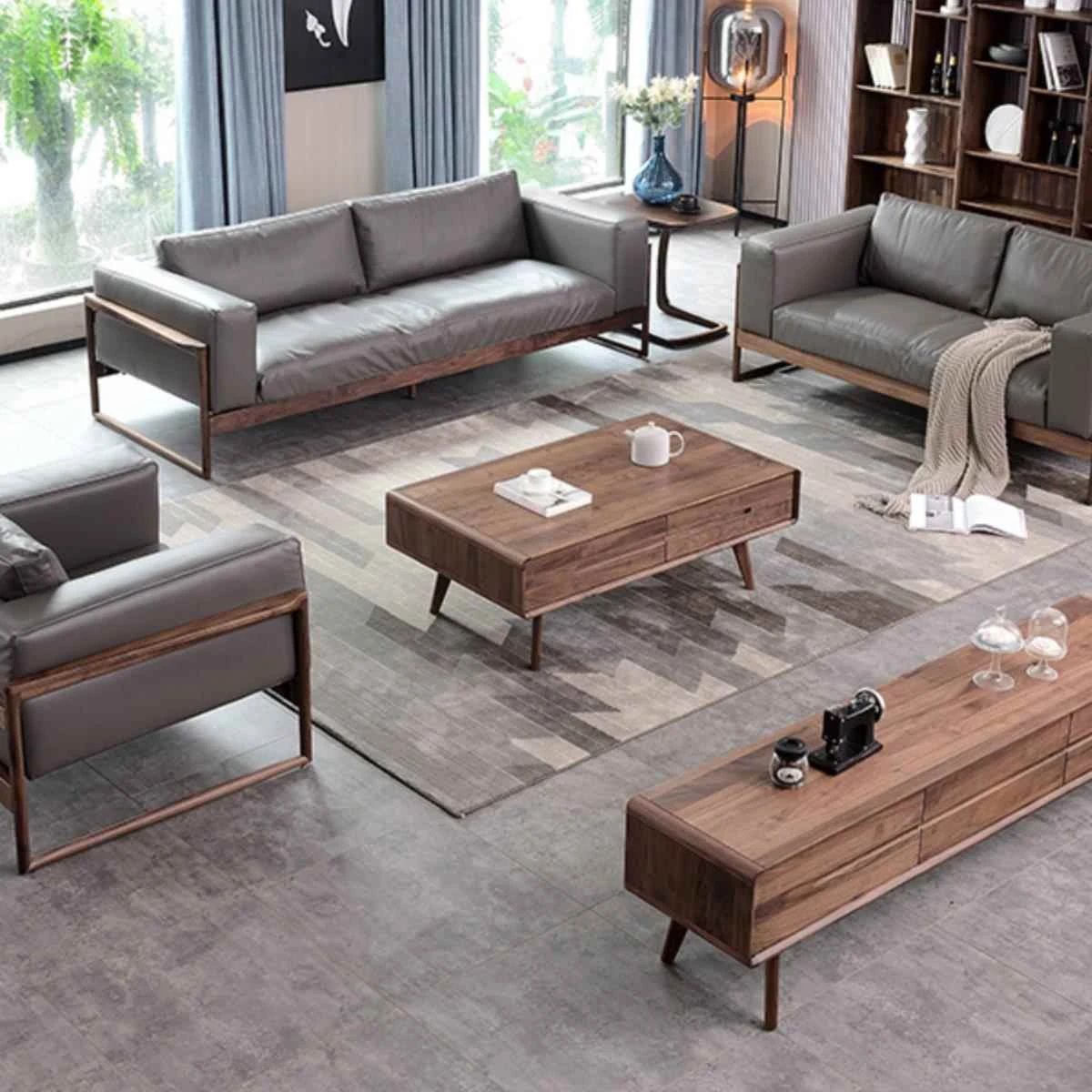 北欧スタイルの無垢材ソファセット|北米産ウォールナット使用|イタリアンミニマルデザインのラグジュアリー真皮ソファ|リビングにぴったりな3人掛け