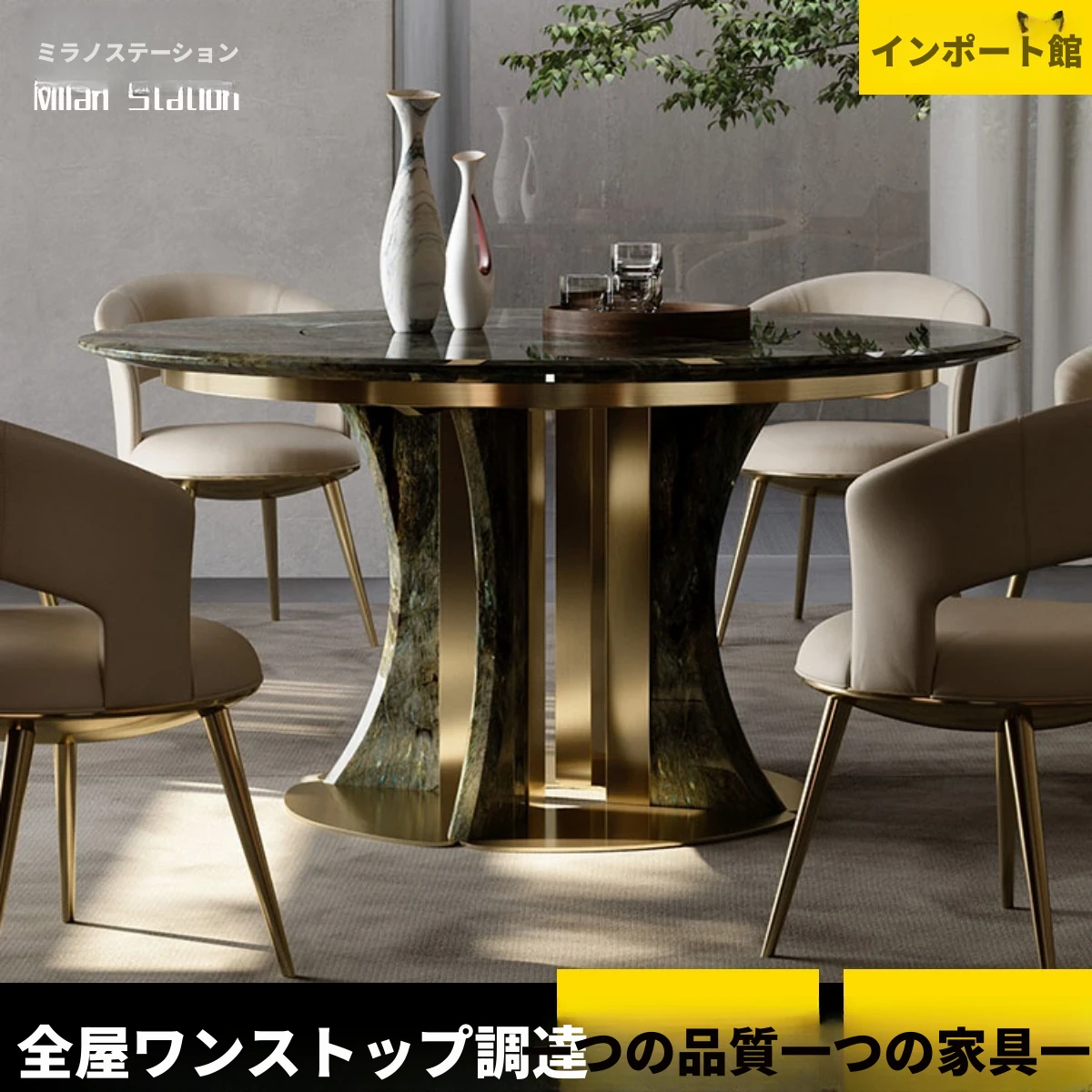 イタリアンラグジュアリー 丸型天然大理石ダイニングテーブル - イタリアデザインのステンレス製テーブル&チェアセット。高級感あふれる本格派、家族の団欒にぴったりな無垢材使用の食卓。
