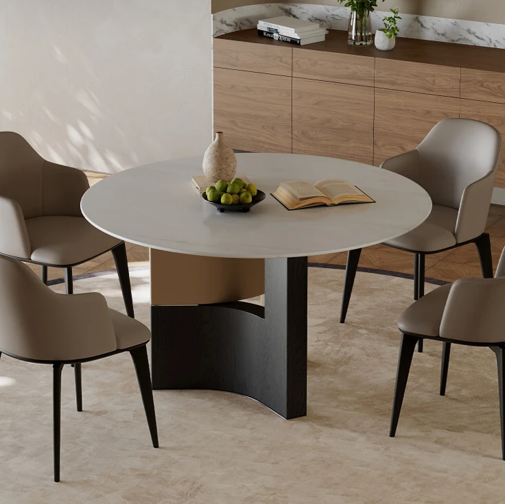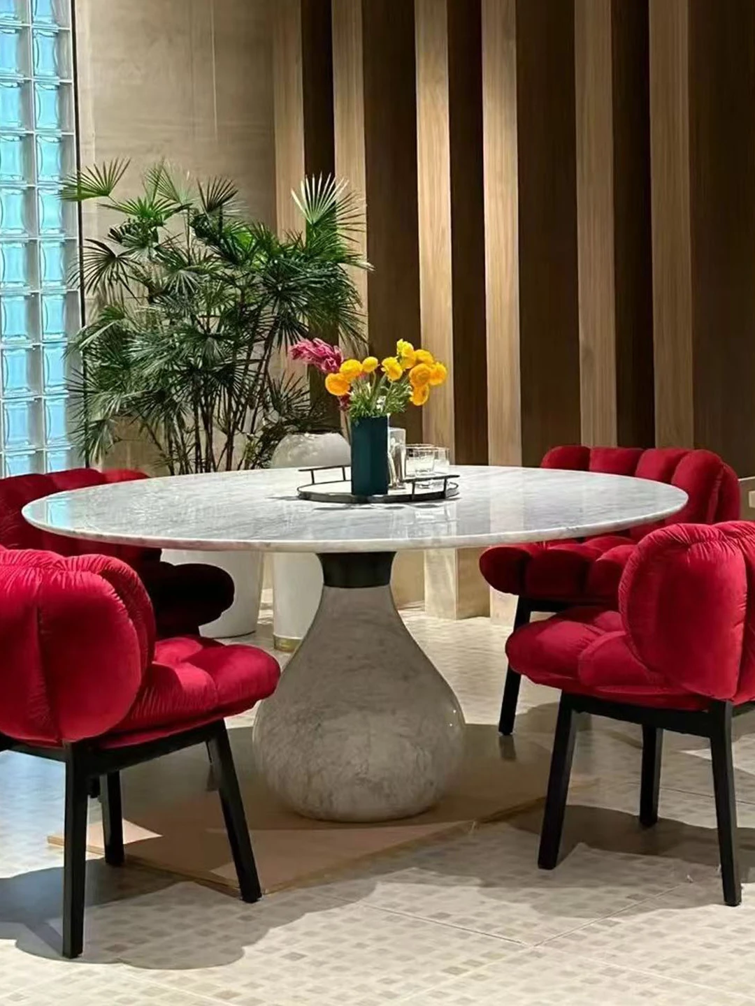 デザイナーによるイタリアンミニマリズムの大理石ダイニングテーブル - 小さなスペースにも最適な円形の高級無垢材使用、リビングやダイニングにぴったりのスタイリッシュなアイテム。あなたの食卓を特別に演出します!