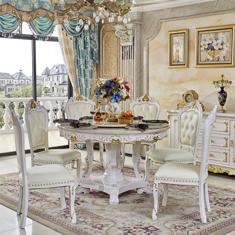 欧風真皮リビングダイニングテーブルセット - 高級無垢材と大理石のラウンドテーブル、6脚の椅子付き、回転式ターンテーブルで食事がもっと楽しく!