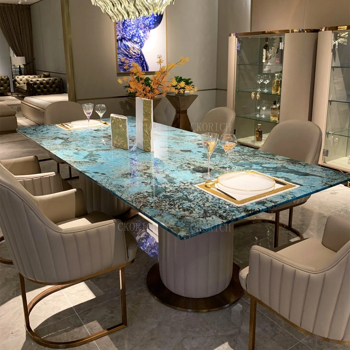 イタリア直輸入のラグジュアリーなファンタジーブルー天然大理石使用!エレガントなイタリアンスタイルの軽やかな長テーブルとチェアセット。別荘や広々としたフラットにぴったりな高級感溢れるダイニング体験をお楽しみください。