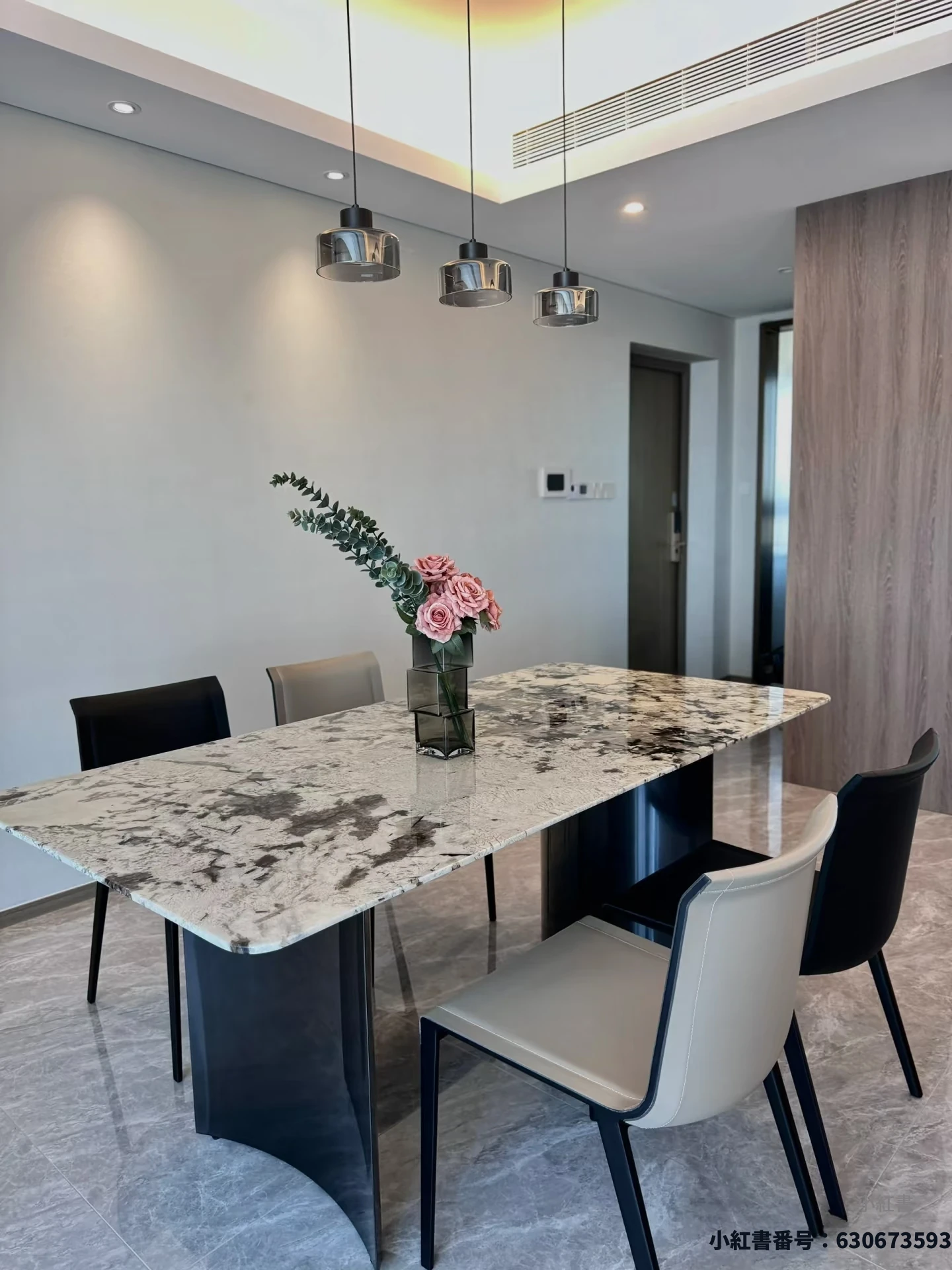 上質な大理石を使用した軽奢スタイルのダイニングテーブル&チェアセット。天然の豪華感が漂う超晶石と美しい彩晶石を組み合わせた長方形テーブル。おしゃれな空間を演出する理想的なアイテムです。