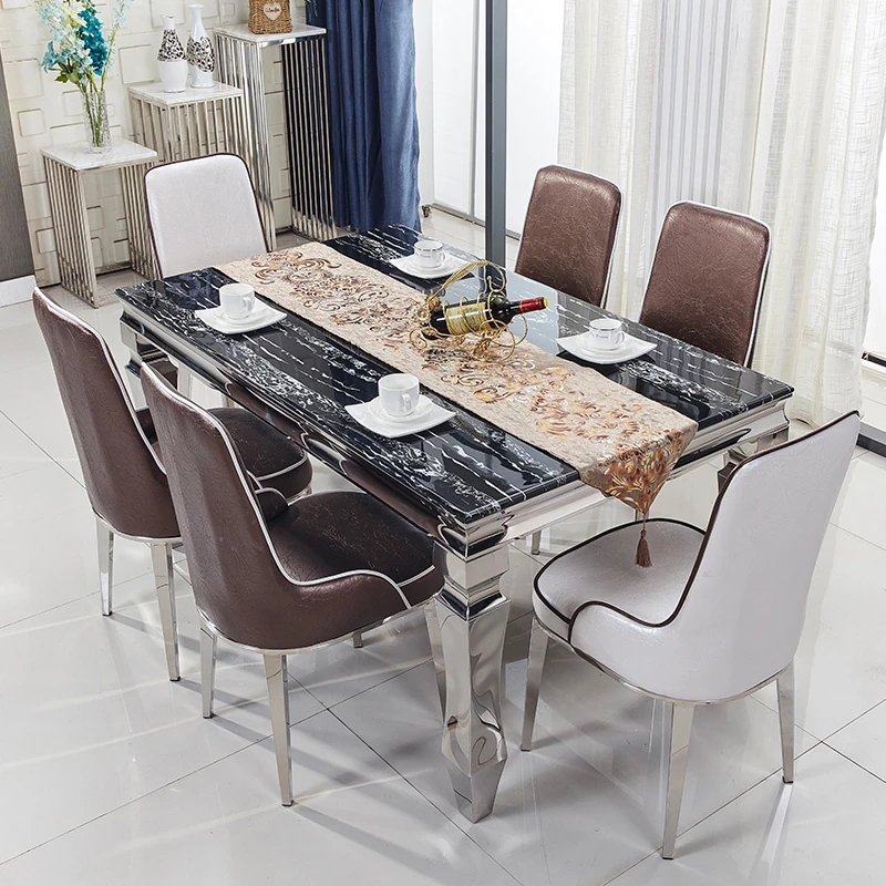 軽やかで贅沢なステンレス製ダイニングテーブル - モダンな香港スタイル、家庭用高級大理石トップ、6人掛けデザインテーブル。洗練されたおしゃれ空間を演出します!