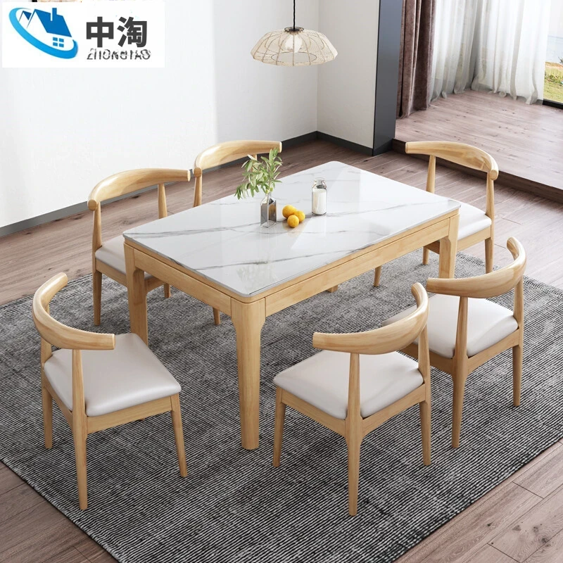 新中式デザインの無垢材ダイニングテーブル&チェアセット - 大理石のモダンでシンプルな四角形テーブル、コンパクトな住まいに最適な軽やかなラグジュアリー感のある食卓。