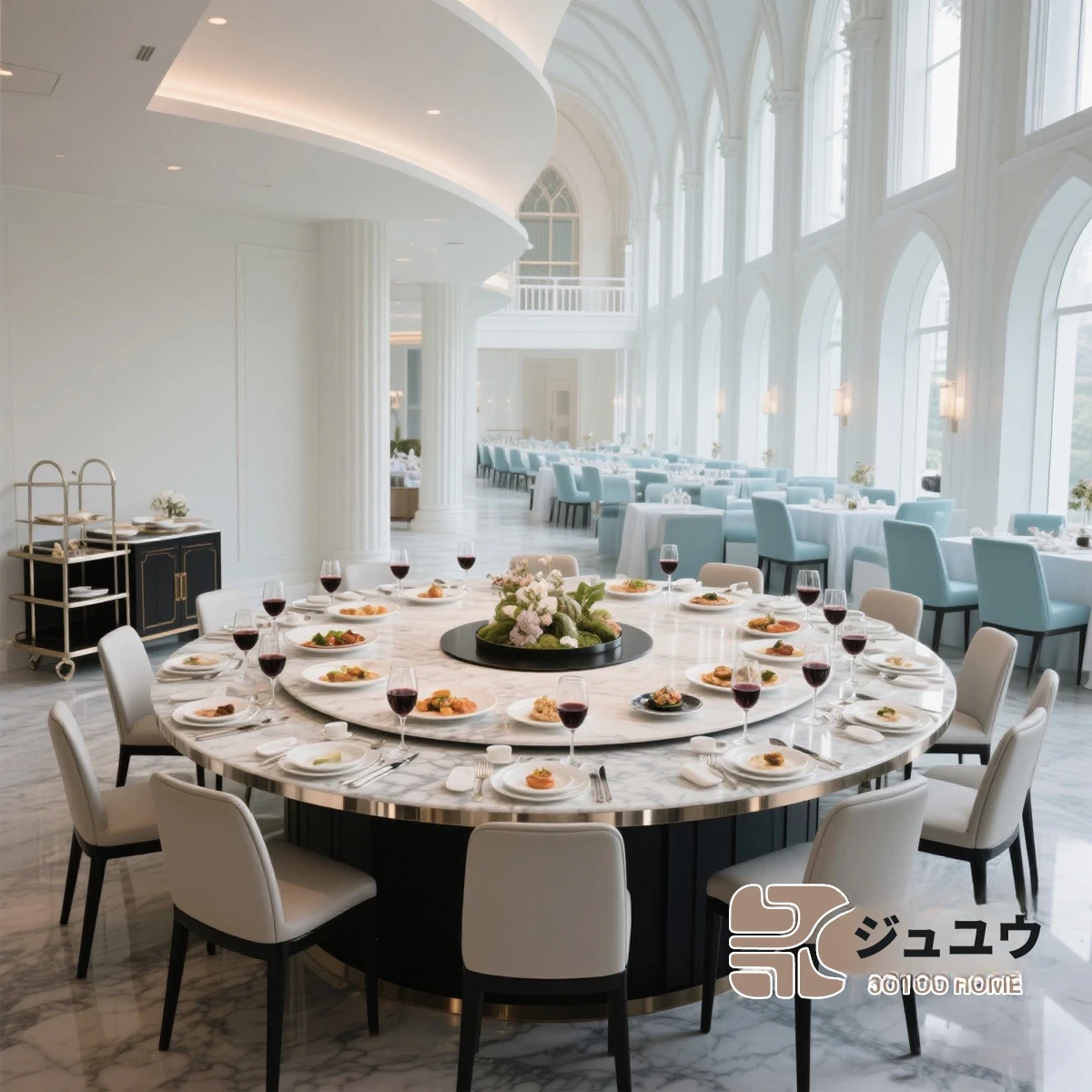 北欧スタイルのジャズホワイト大理石ダイニングテーブル - 3mで28人収容可能な豪華ホテル向け、さらに3.4mの電動ラウンドテーブルは20人、2mサイズもご用意!エレガントなデザインで特別なひとときを演出します。
