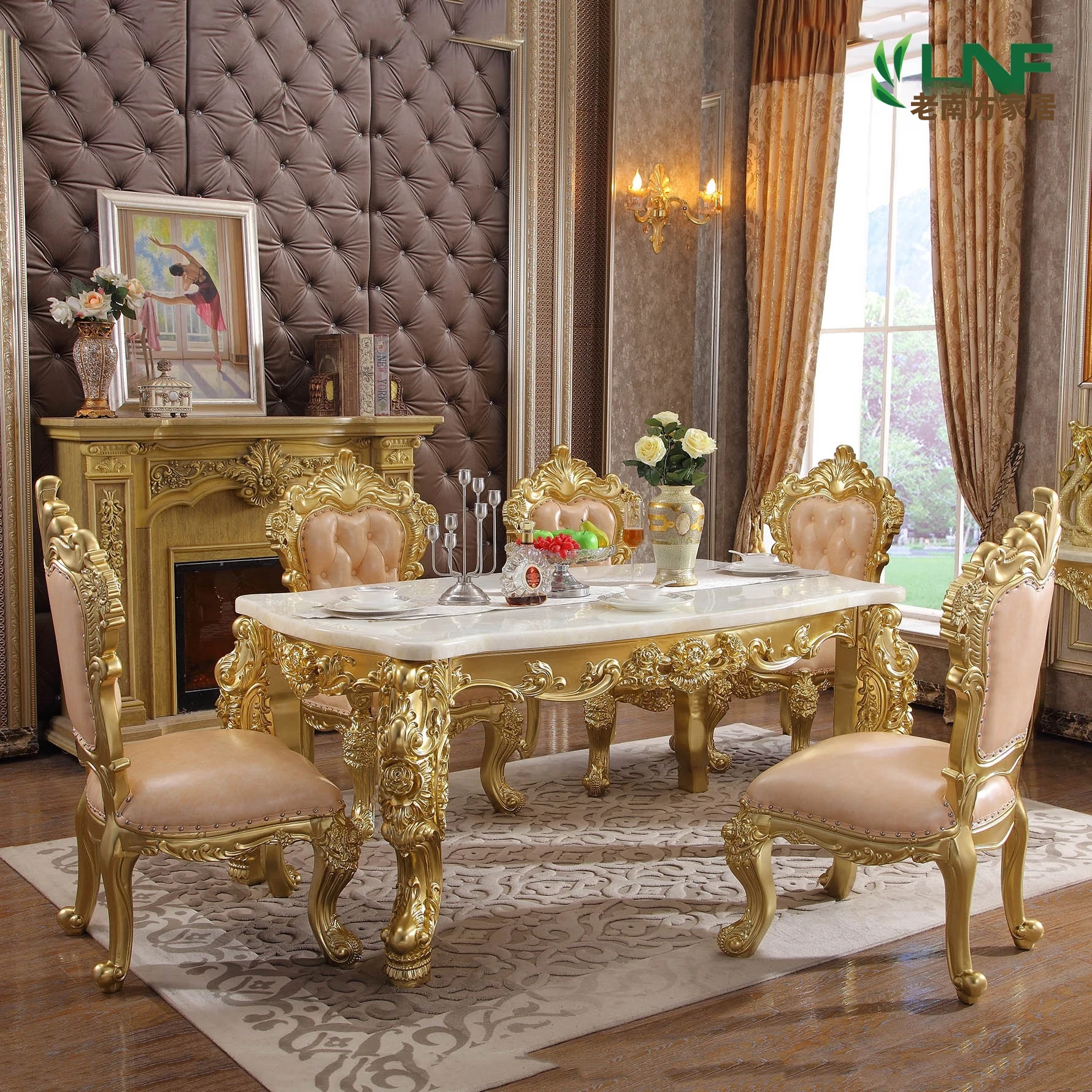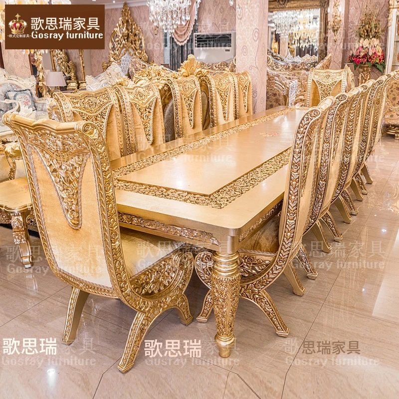 豪華な欧風金箔ダイニングテーブルセット - フランス宮廷スタイルの彫刻入り無垢材長方形テーブルと椅子、広々とした別荘にぴったり!