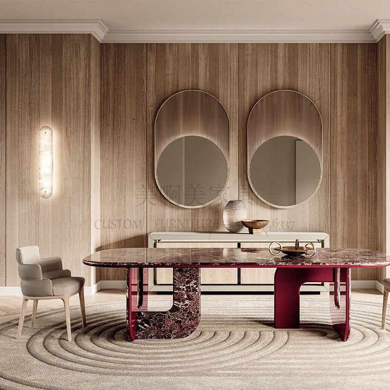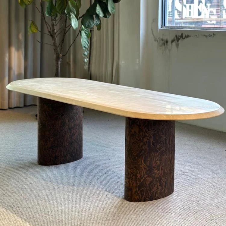 ヴィンテージ風の無垢材と大理石を使用したアートな侘寂スタイルのダイニングテーブル。家庭用や別荘にぴったりなエレガントな楕円形デザインで、食事の時間を特別なものに演出します。