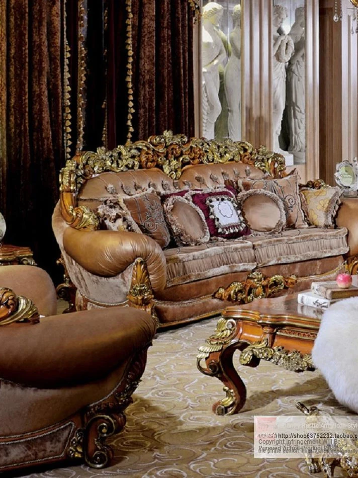 Luxurious European Style Genuine Leather Sofa Set 123 - High-End Solid Wood Villa Furniture for Palace-Style Living Rooms 2024