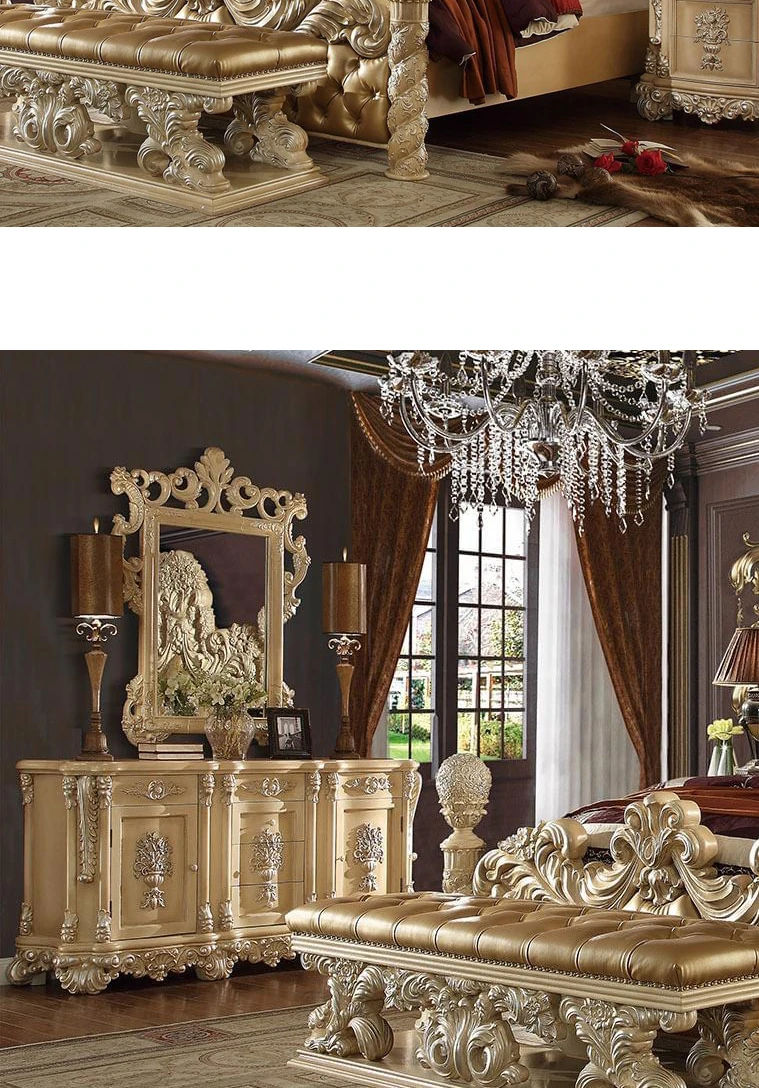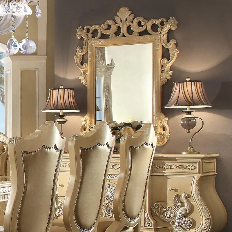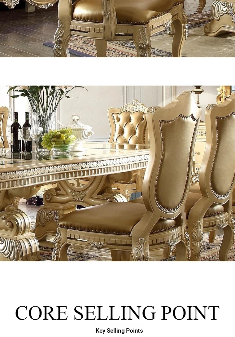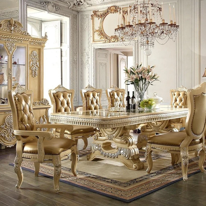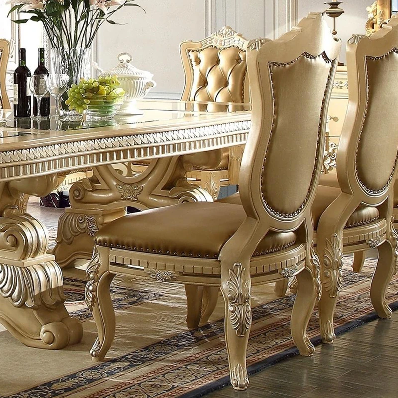Elegant European Luxury Solid Wood Dining Table with Genuine Leather Chairs, Hand-Carved French Palace Sideboard, Baroque Style for Exquisite Dining Experience