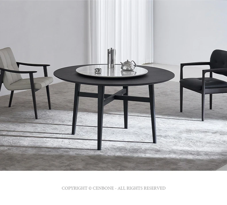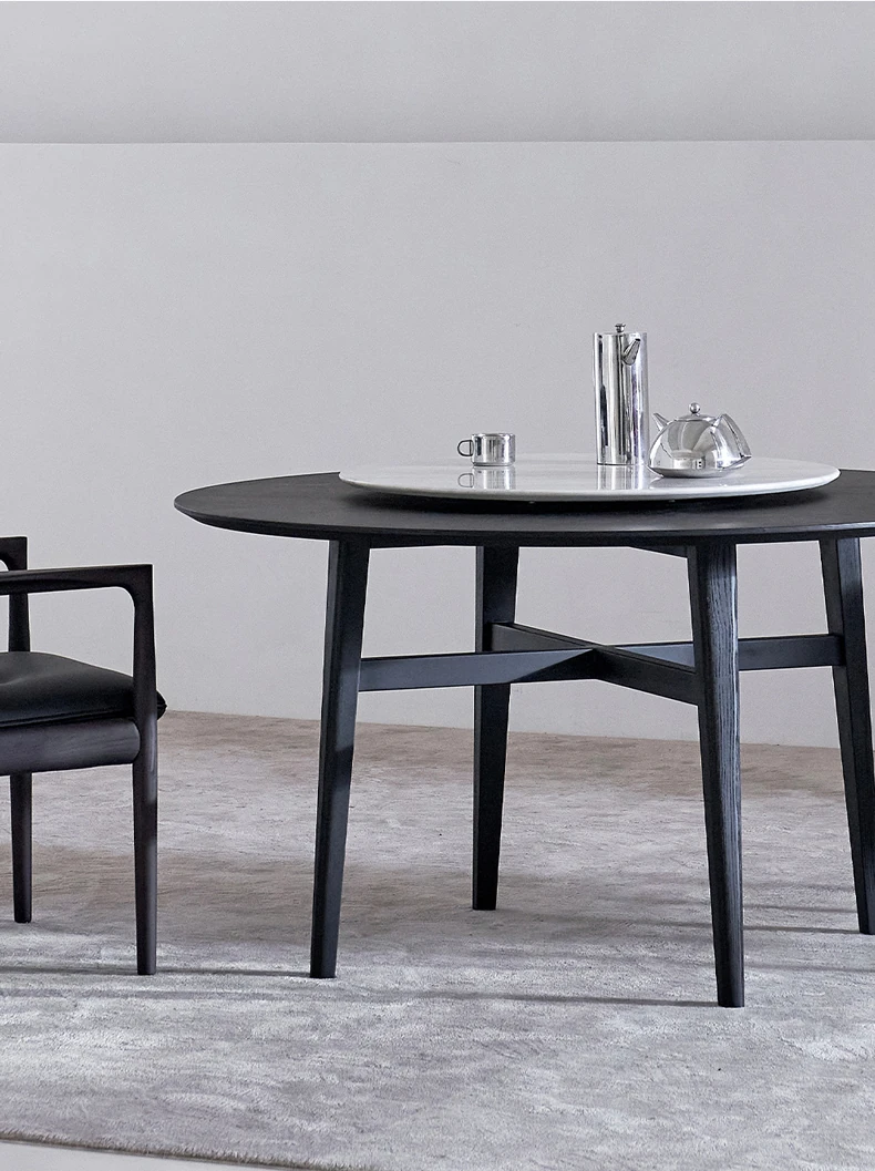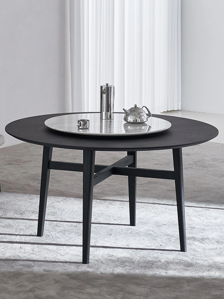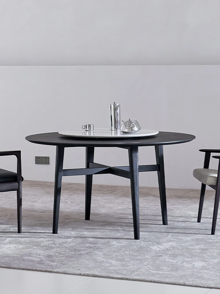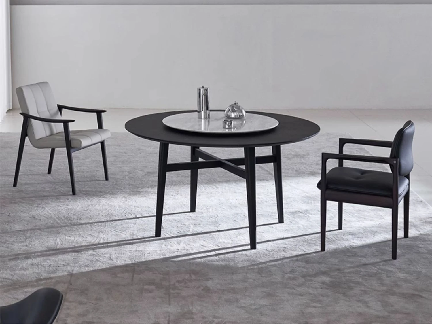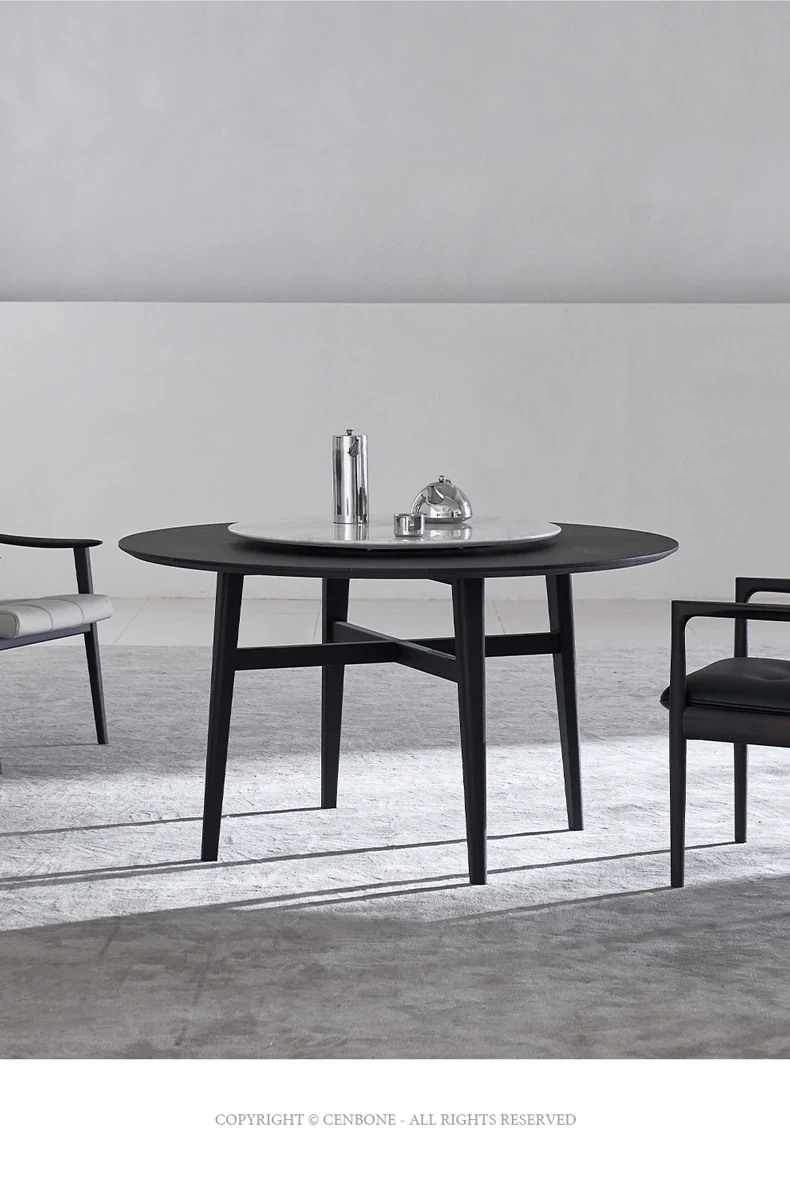 Elegant Italian Minimalist Round Dining Table with Smoky Finish and Turntable, Solid Wood Legs, 1.35m Diameter - CT-350