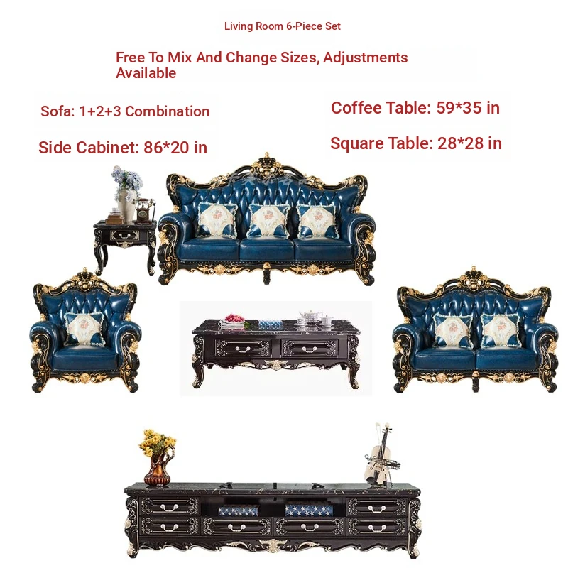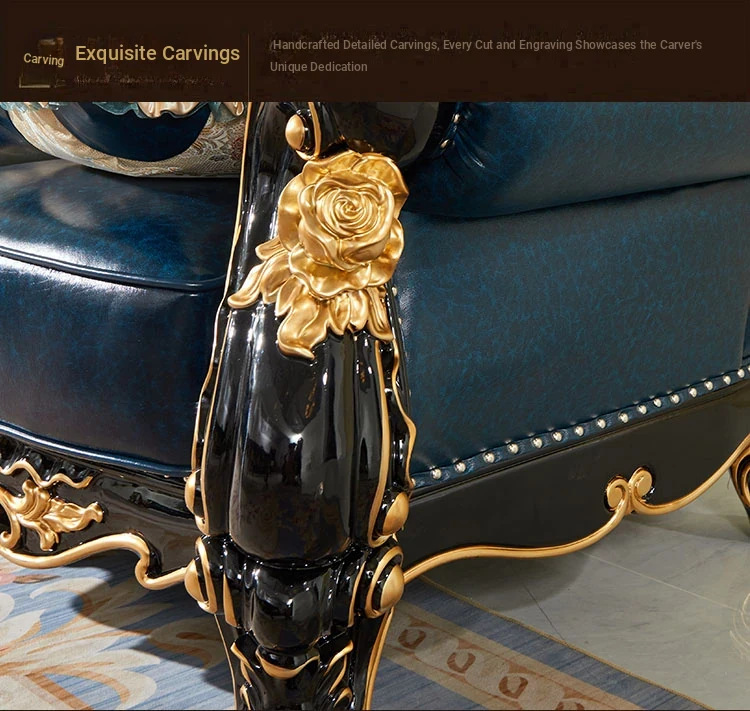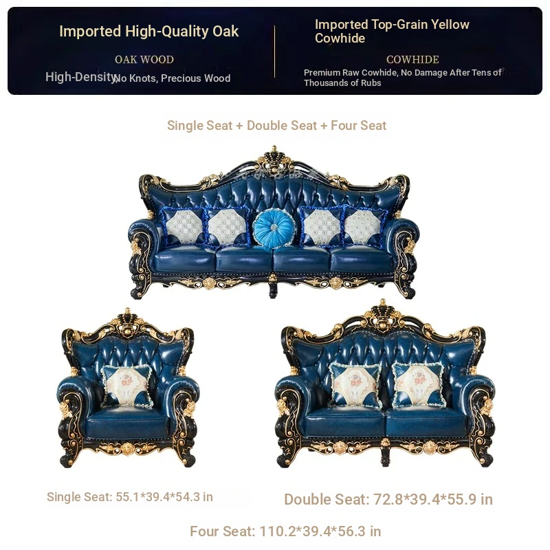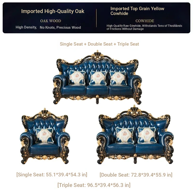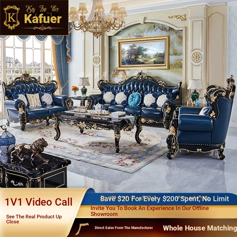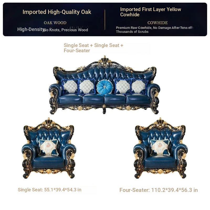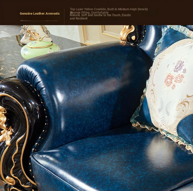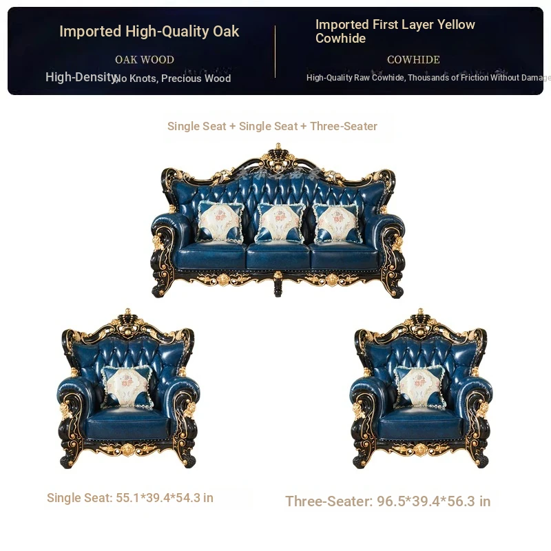European Style Genuine Leather 123 Sofa Set - Luxurious Villa Living Room with Hand-Carved Solid Wood Crown Sofa for an Elegant Touch