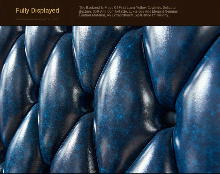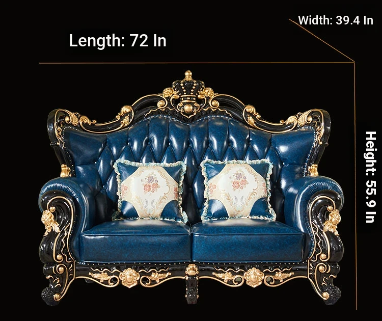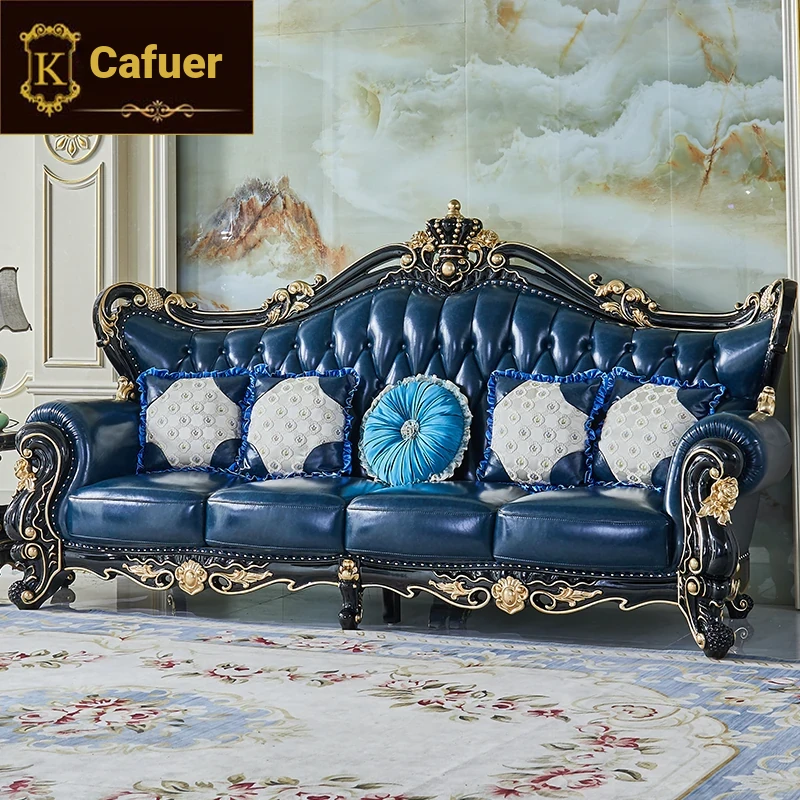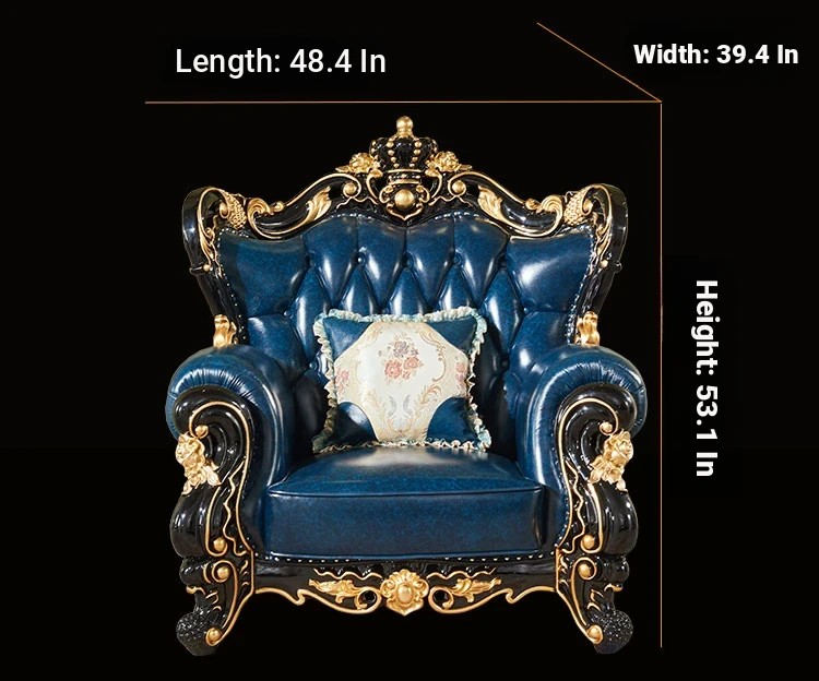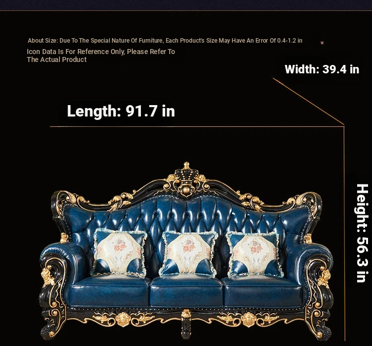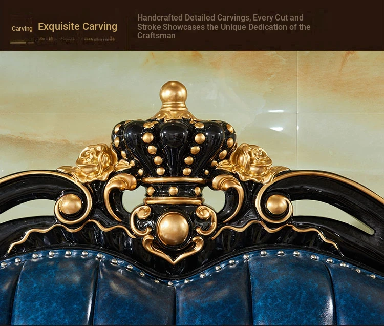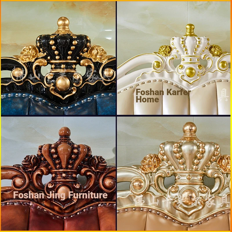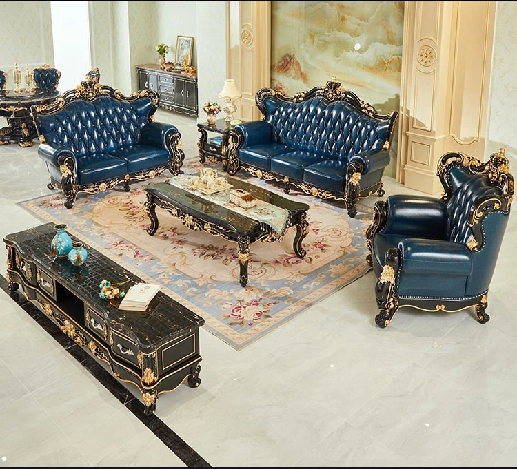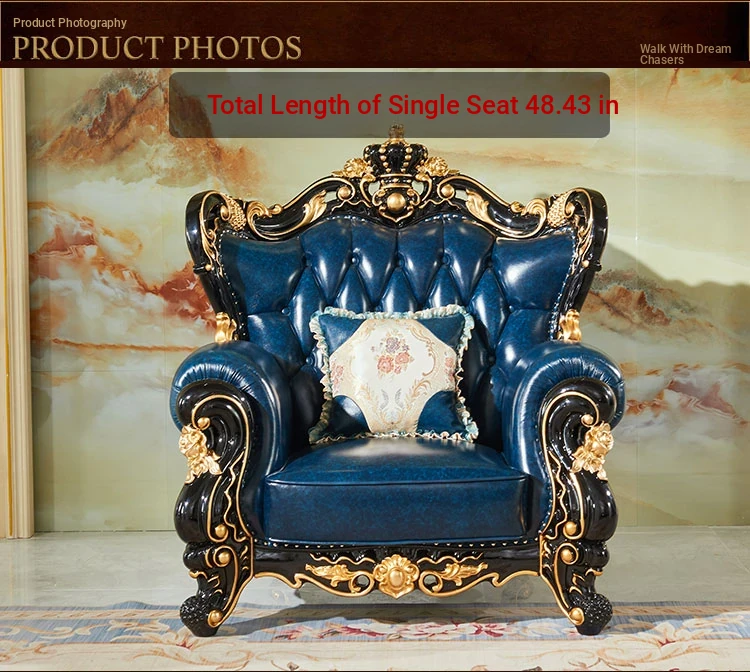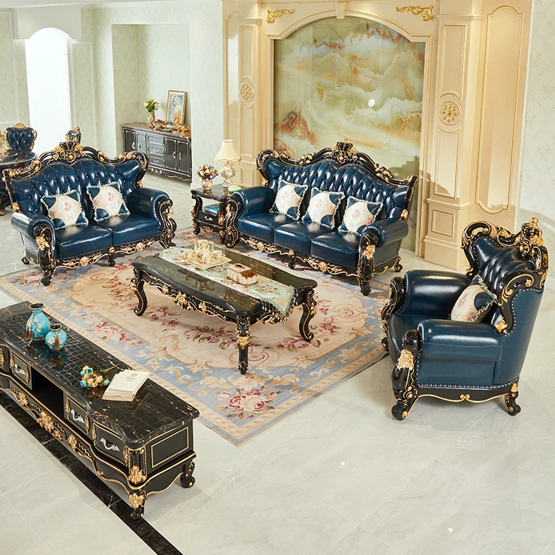 European Style Genuine Leather 123 Sofa Set - Luxurious Villa Living Room with Hand-Carved Solid Wood Crown Sofa for an Elegant Touch