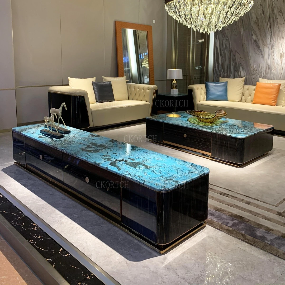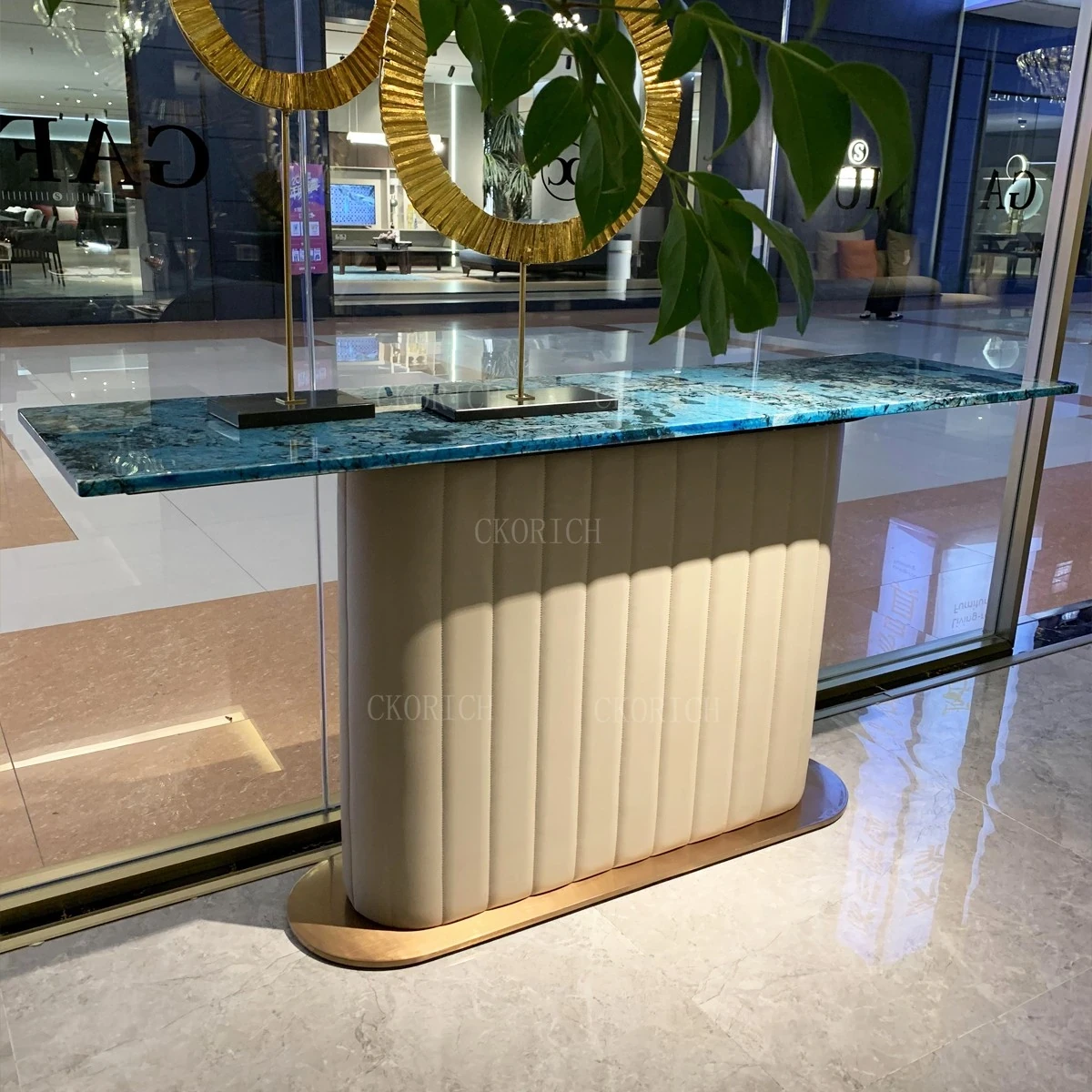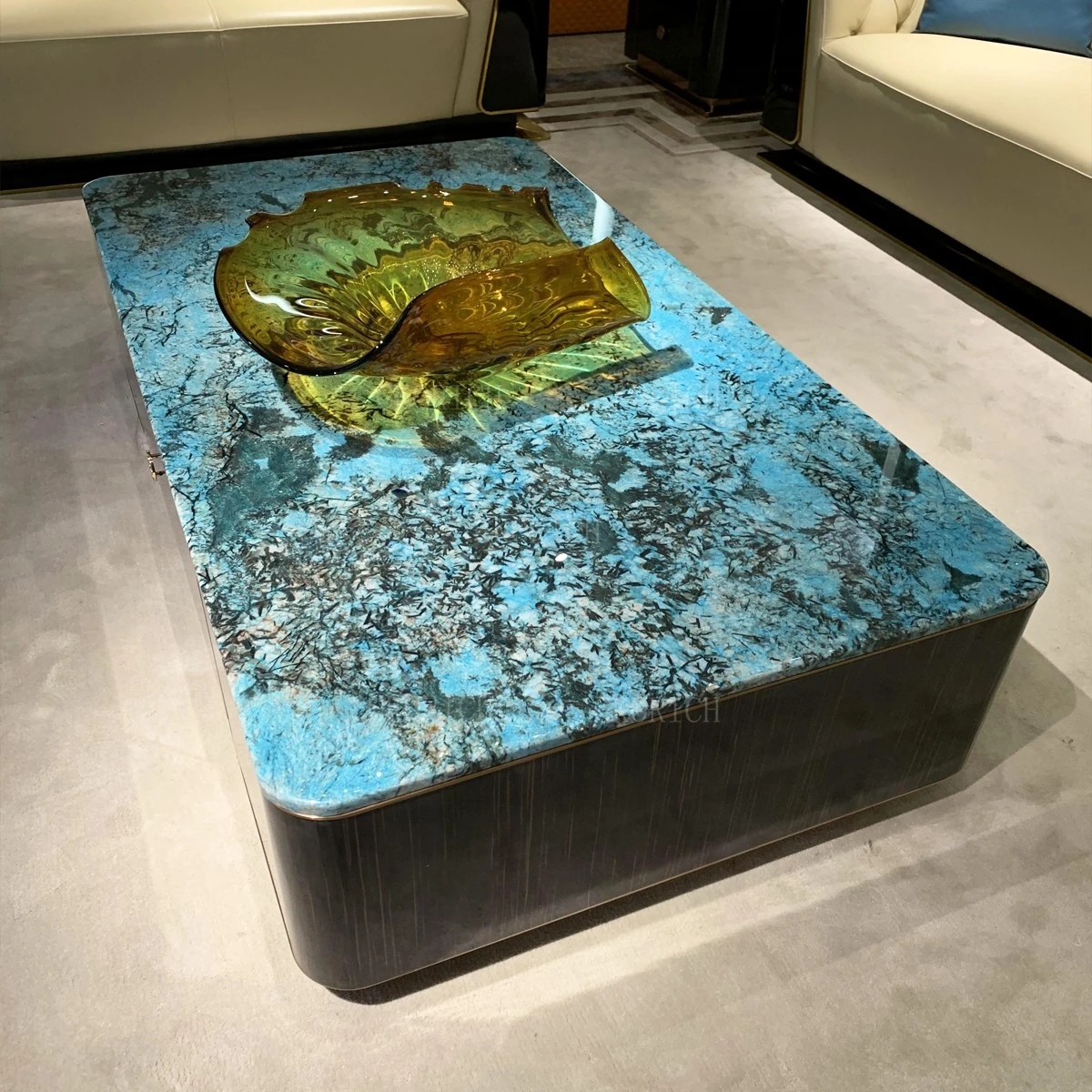 Italian Imported Luxury Fantasy Blue Natural Marble Italian Light Luxury Long Dining Table and Chairs for Villa and Spacious Apartment