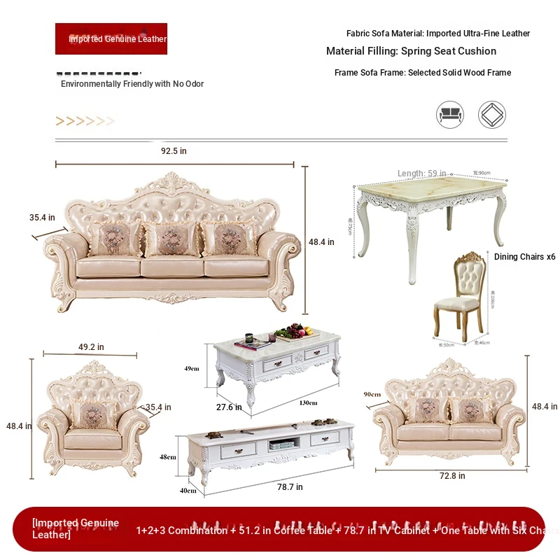 Import leather 1+2+3 combination +51.18 in marble tea table +78.74 in TV cabinet + one table and six chairs