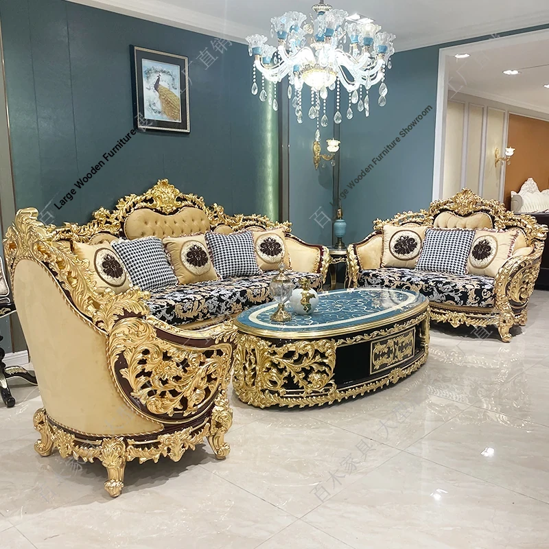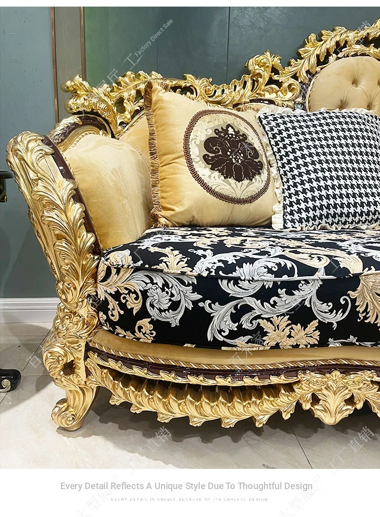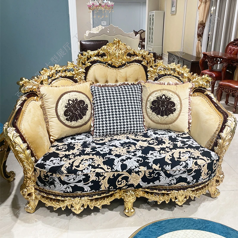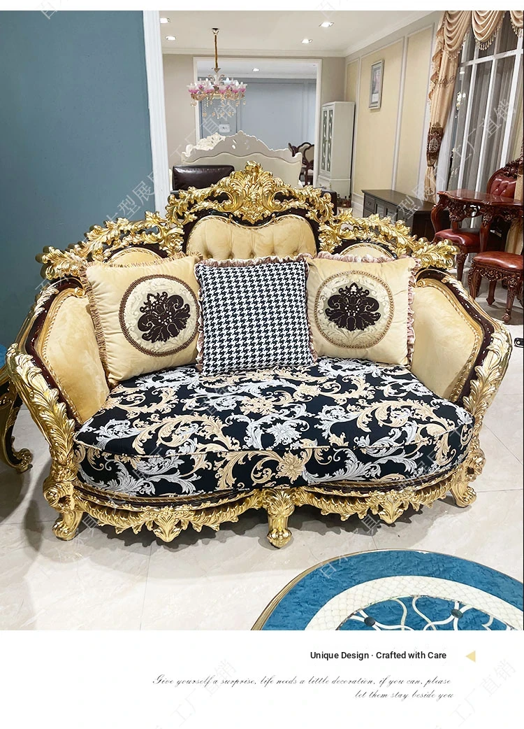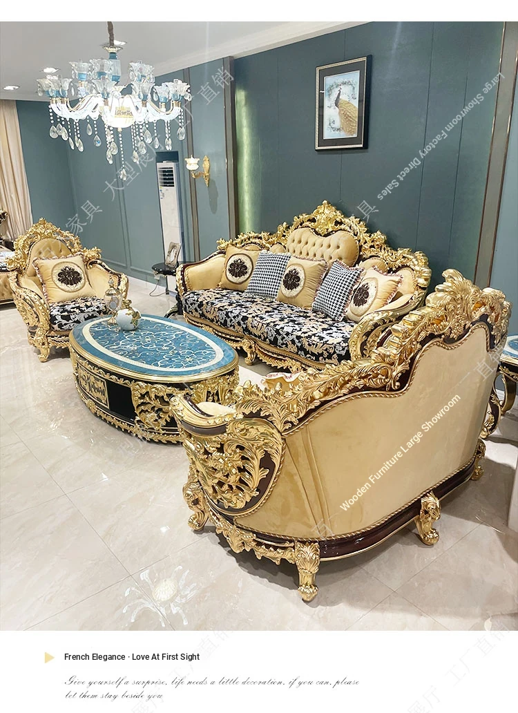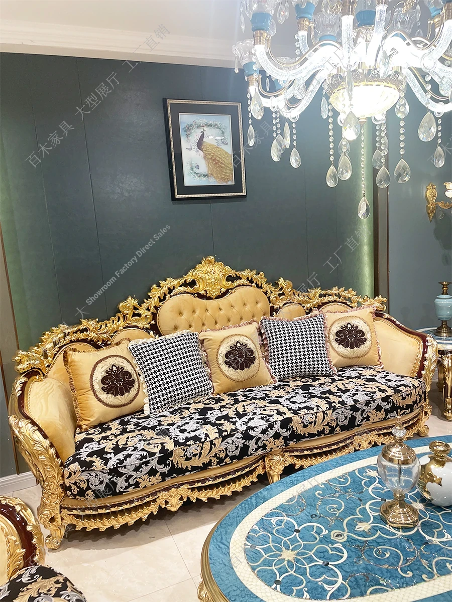 Luxurious French Court-Inspired Sofa with Handcrafted Wooden Carvings and Gold Leaf Accents - Elegant Fabric Sofa for Villas and Spacious Living Rooms, Hand-Painted Furniture for a Regal Touch.