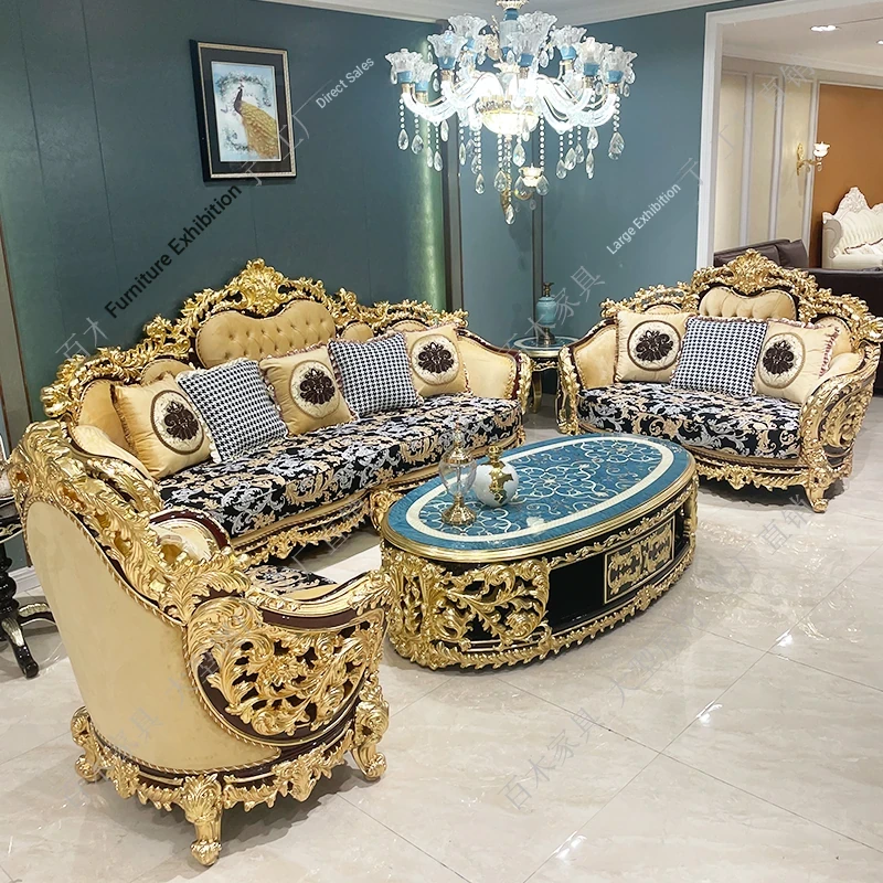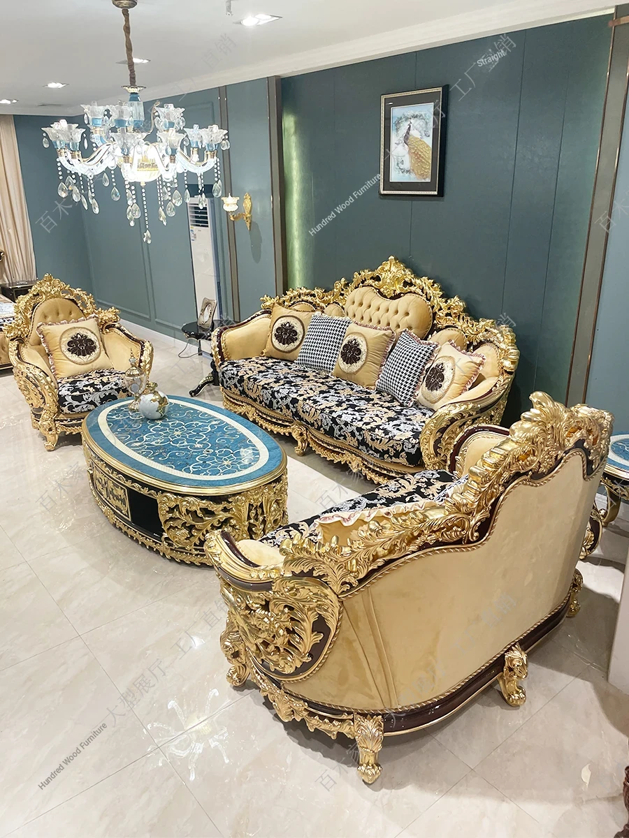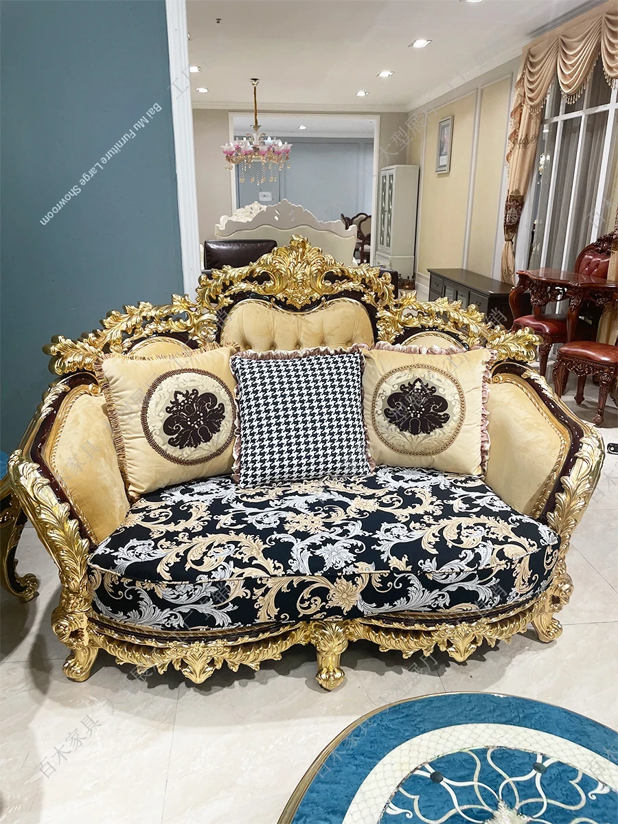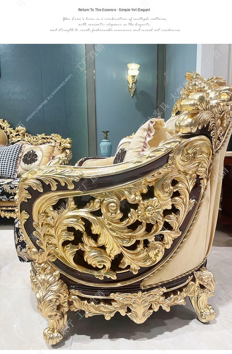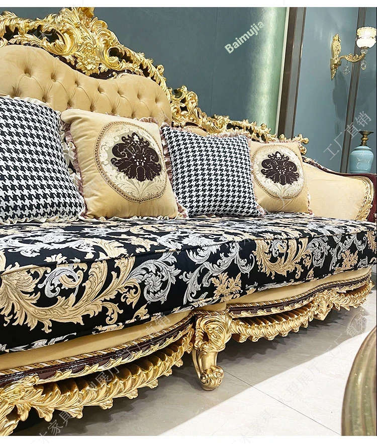 Luxurious French Court-Inspired Sofa with Handcrafted Wooden Carvings and Gold Leaf Accents - Elegant Fabric Sofa for Villas and Spacious Living Rooms, Hand-Painted Furniture for a Regal Touch.