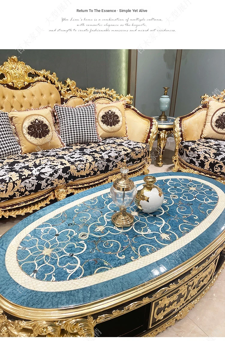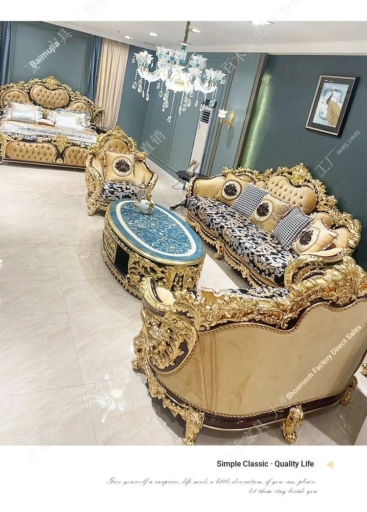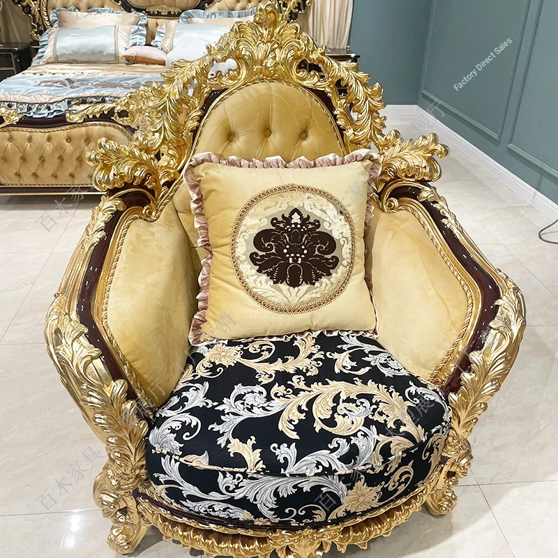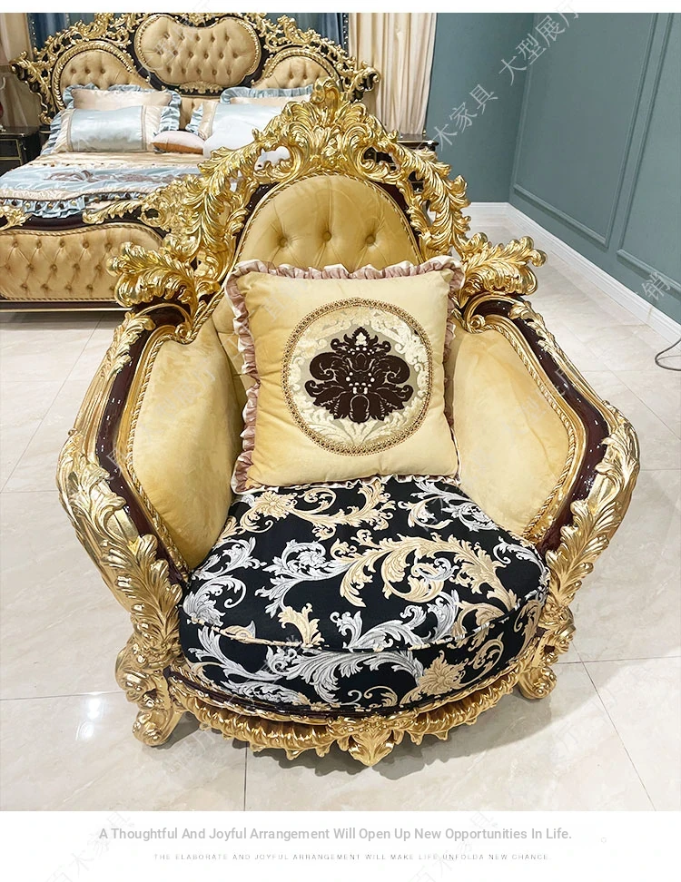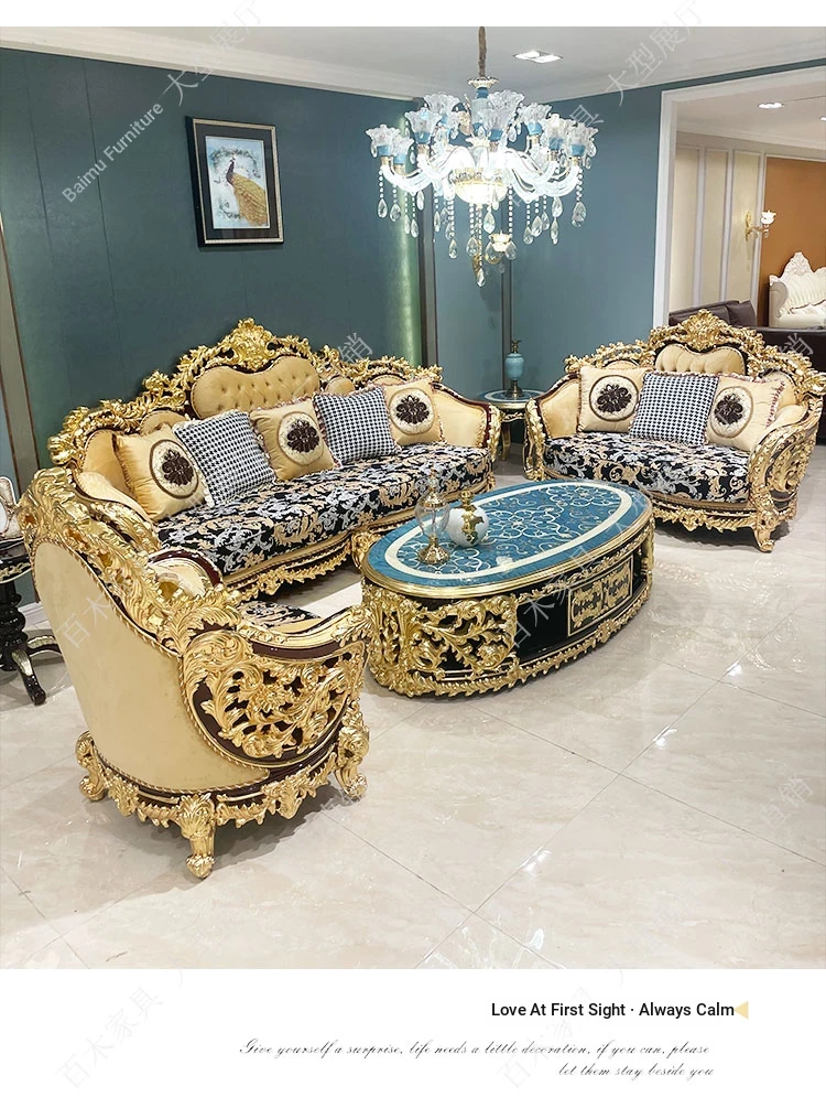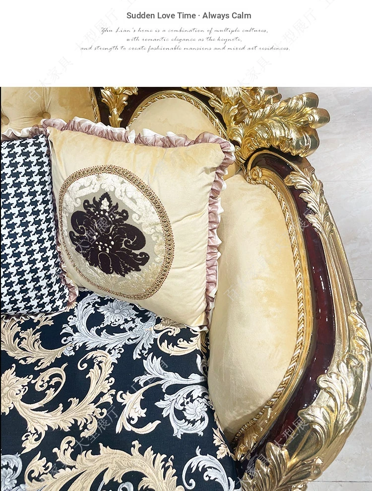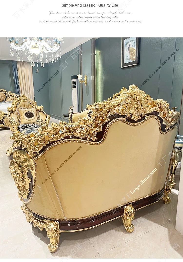 Luxurious French Court-Inspired Sofa with Handcrafted Wooden Carvings and Gold Leaf Accents - Elegant Fabric Sofa for Villas and Spacious Living Rooms, Hand-Painted Furniture for a Regal Touch.