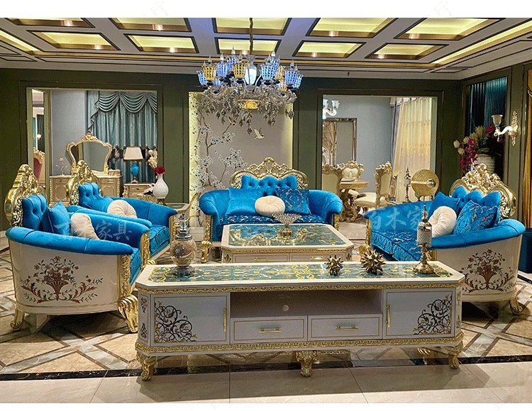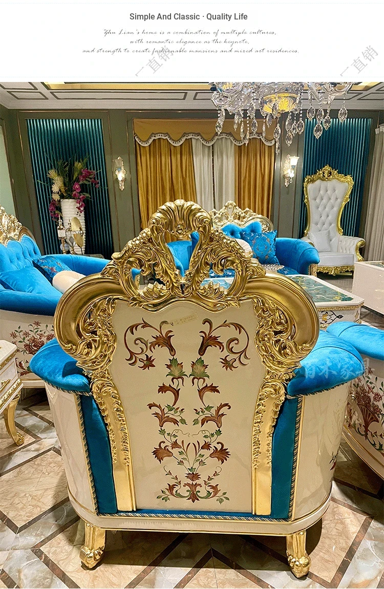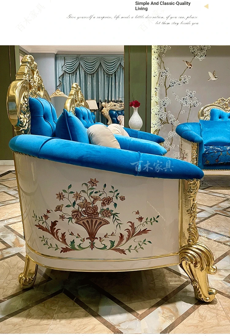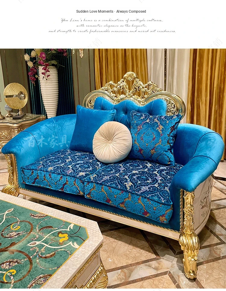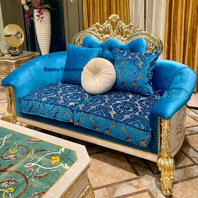 Luxurious French Solid Wood Sofa with Exquisite Carvings and Gold Leaf Accents - Elegant Upholstered Sofa for Villas and Spacious Living Rooms - Perfect for Large Households and Stylish Combinations