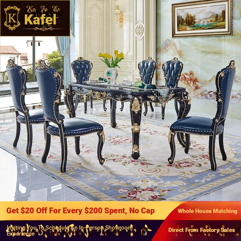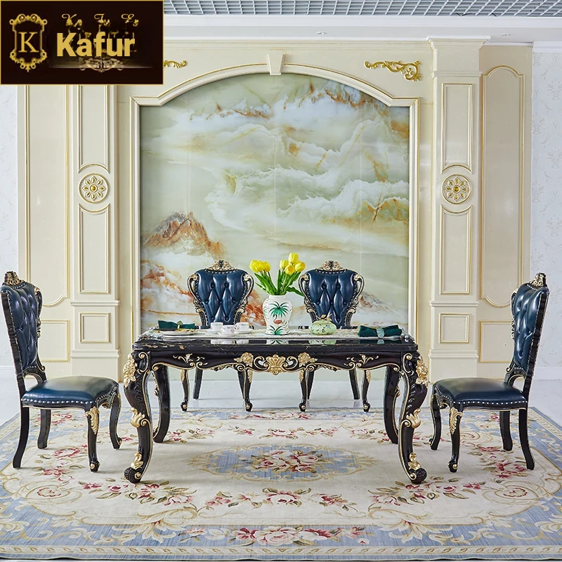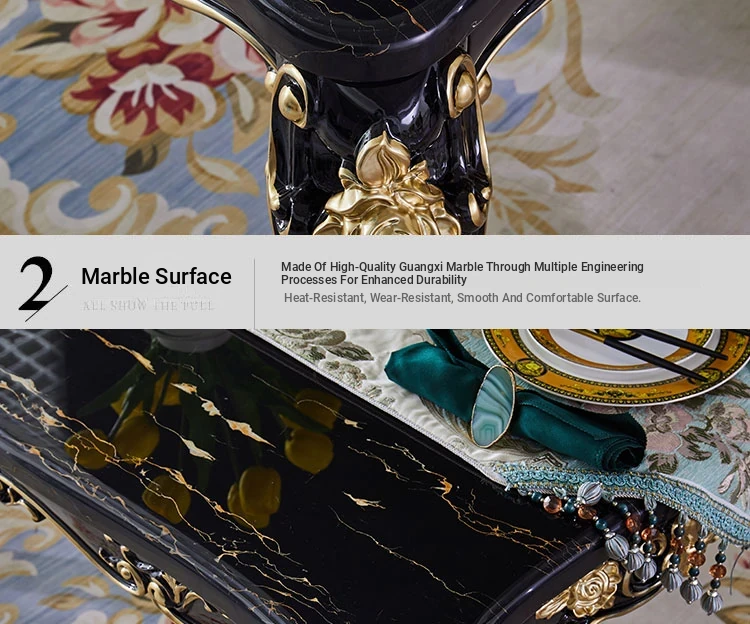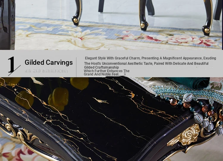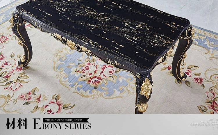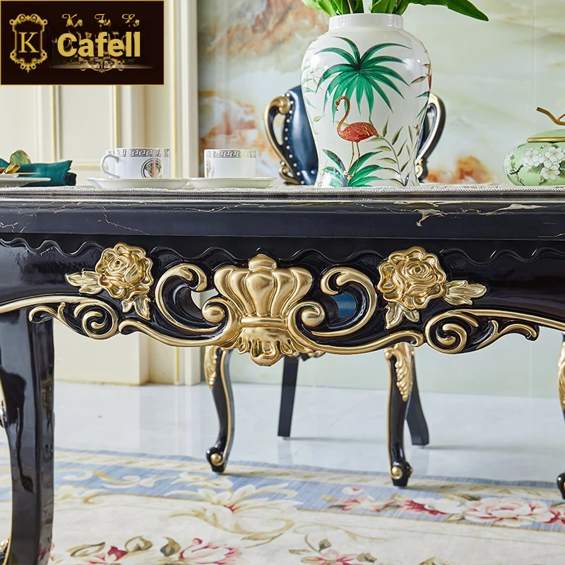 Luxury European-Style Black Walnut Marble Square Dining Table Set with Crown Carvings - Complete Solid Wood Dining Room Furniture for Elegant Living Spaces