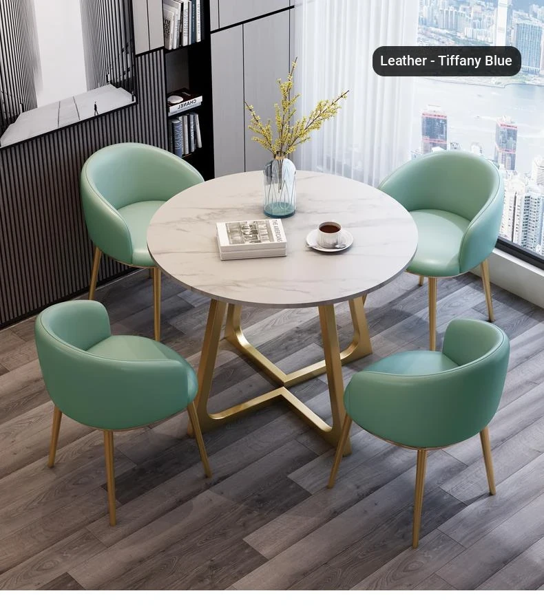 1 Table 4 chairs Tiffany Blue (PU leather) Gold feet white matte rock board