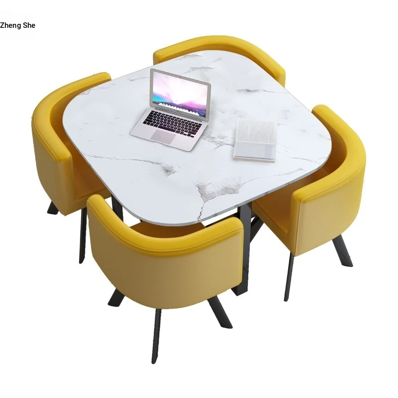 Imitation stone white square + yellow leather chair 1 table 4 chairs 90*90*75
