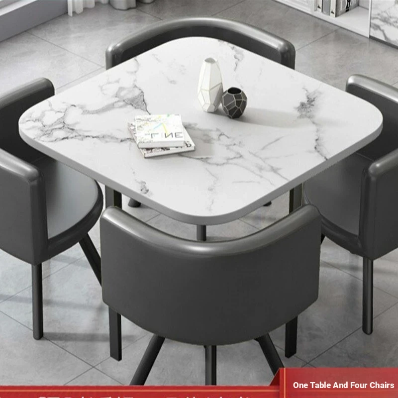 Imitation stone white square + gray leather chair 1 table 4 chairs 90*90*75