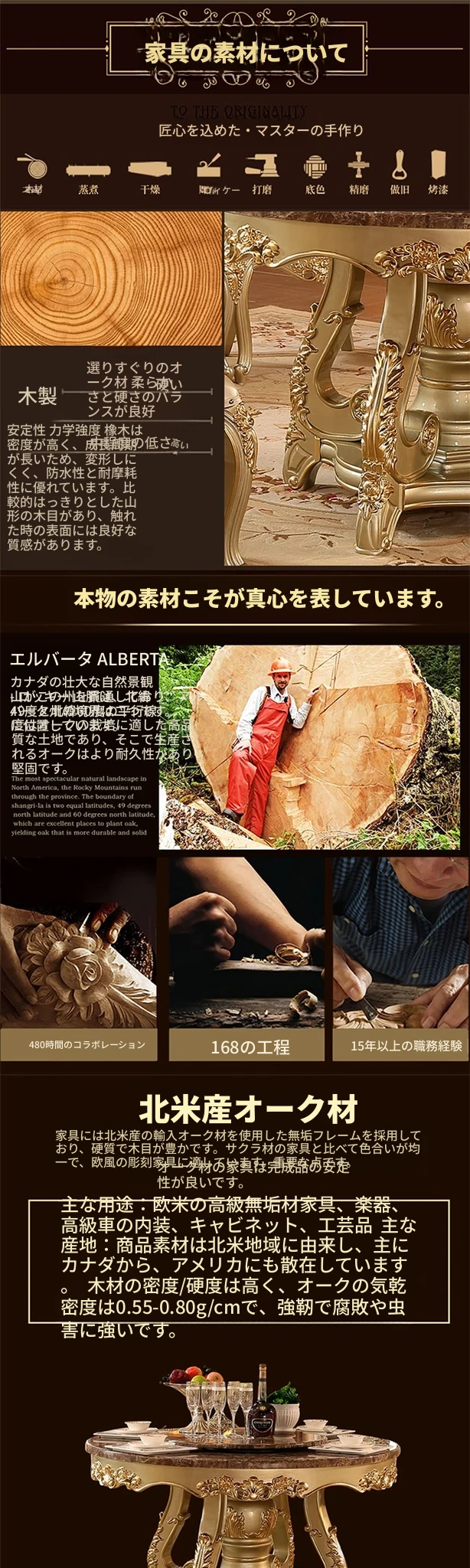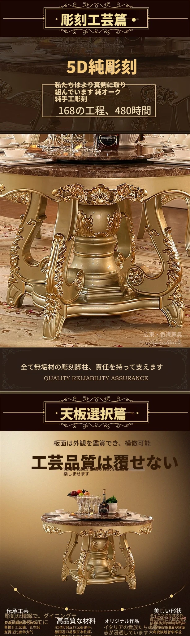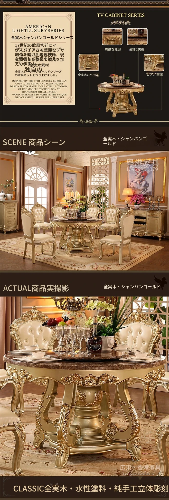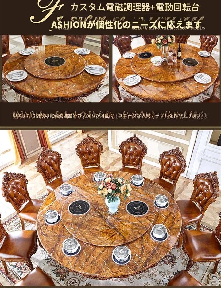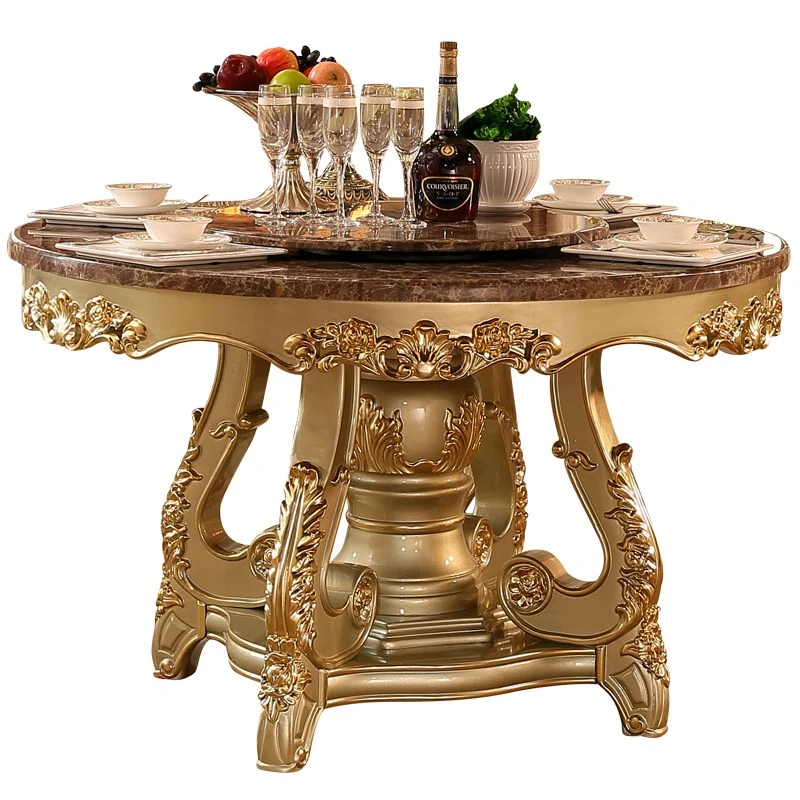 豪華な欧風円形テーブル - アメリカンスタイルの大理石回転台付き、6〜8人用、彫刻仕上げの高級実木ダイニングテーブル。家族や友人との特別な食事を演出します!