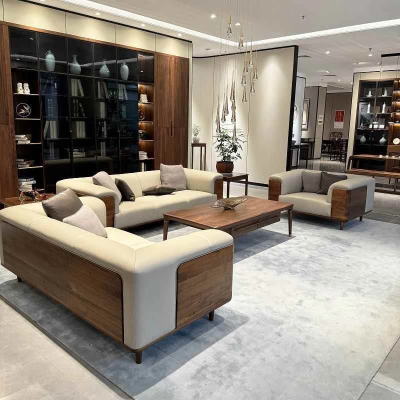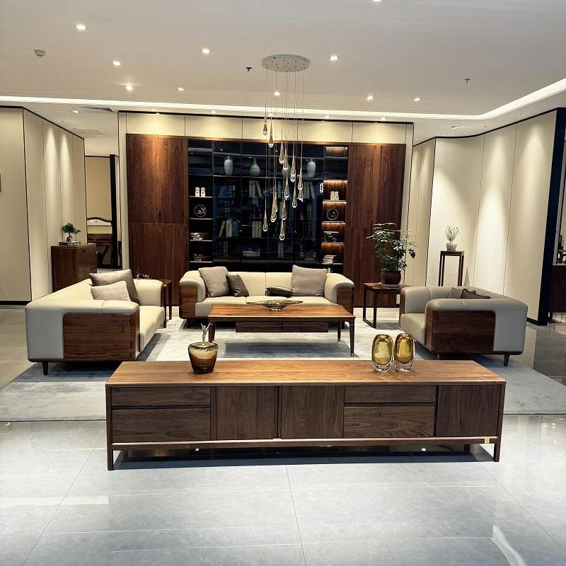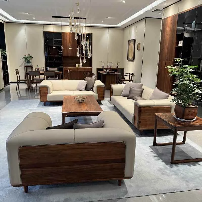 高級感溢れるイタリアンスタイルの本革ソファセット - ブラックウォールナット無垢材使用!広々としたリビングに最適な大容量家具。ヴィラにぴったりの洗練されたデザインで、あなたの空間を格上げします!