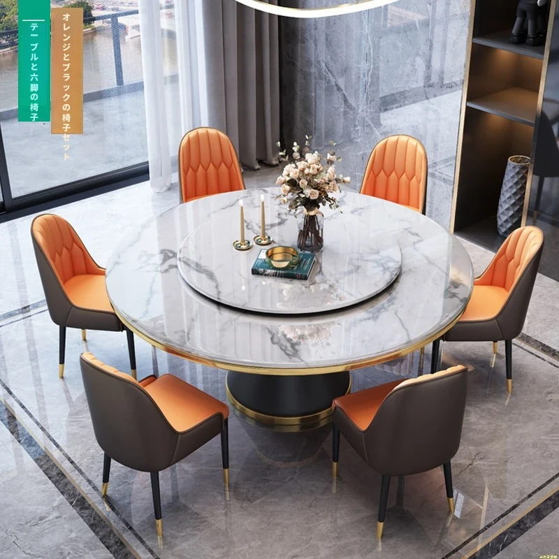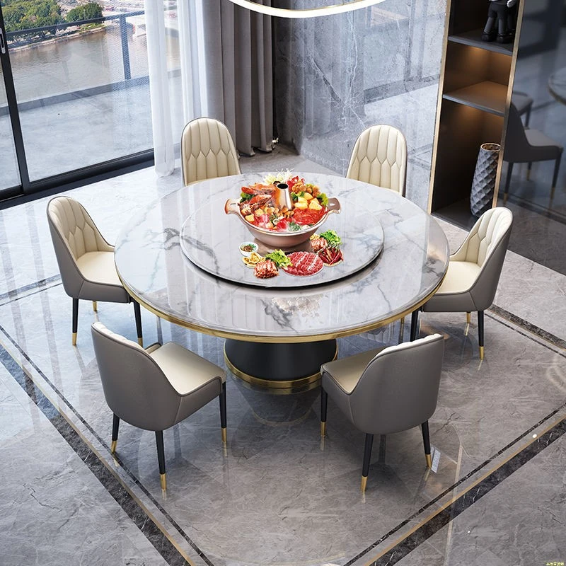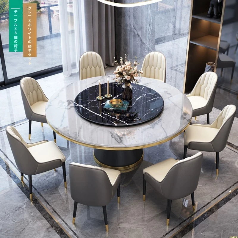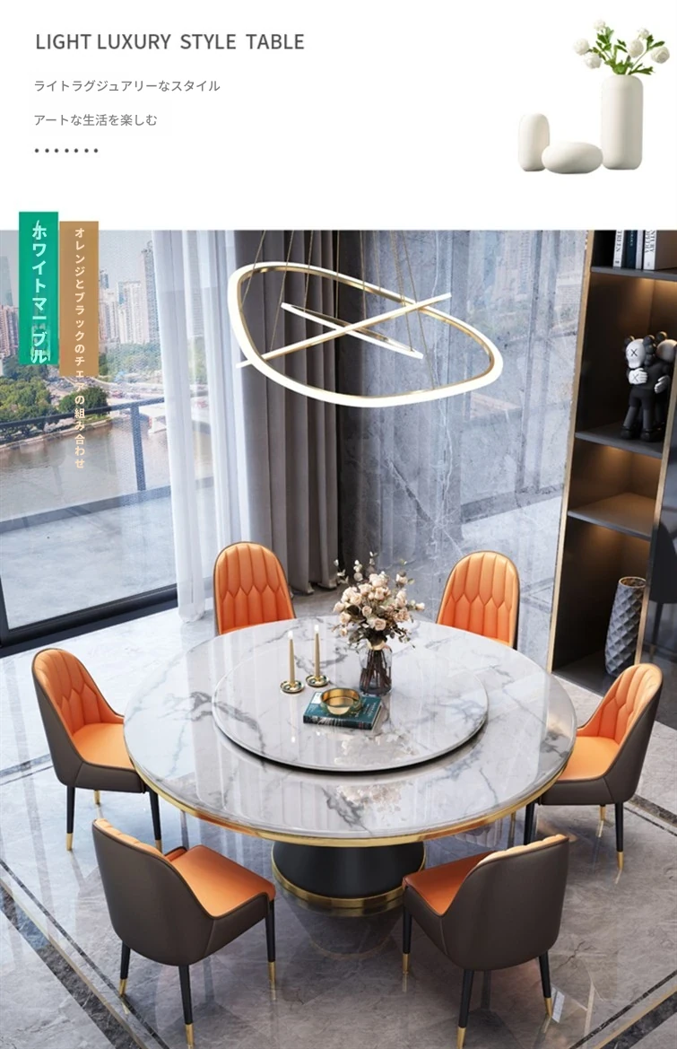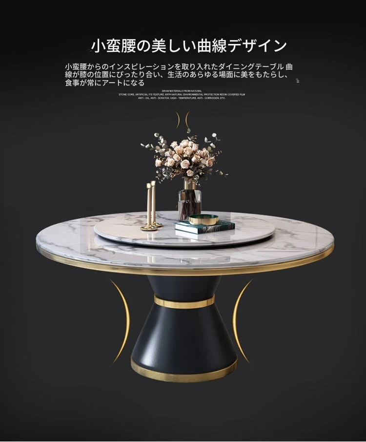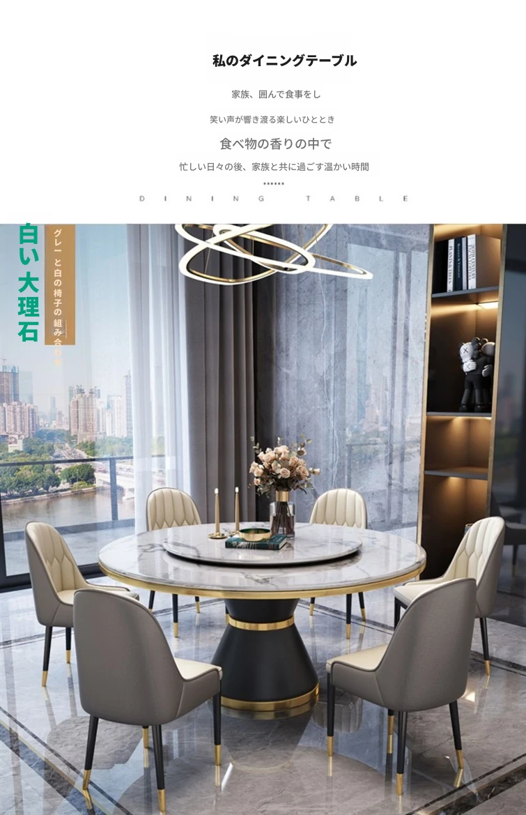 高級感溢れる軽奢岩板ダイニングテーブルセット - モダンな大理石製の円形火鍋テーブル、ホテルや家庭に最適!回転式プレート付きで、食事をもっと楽しめる!