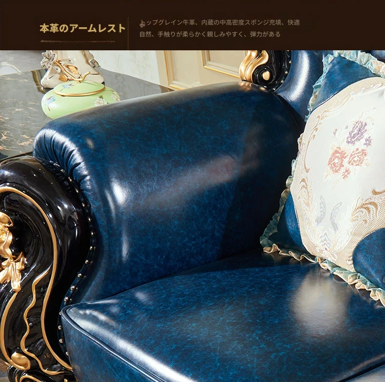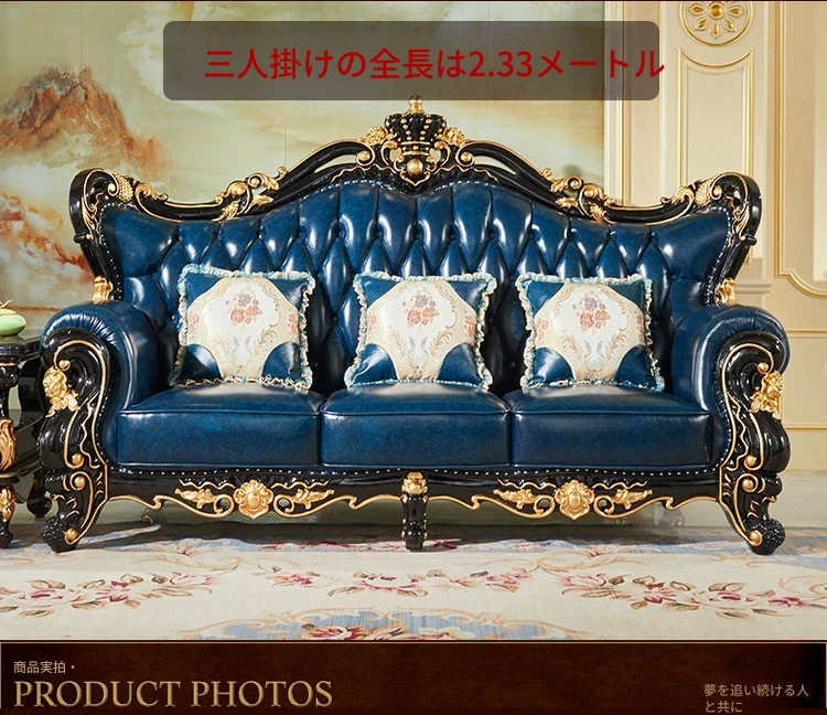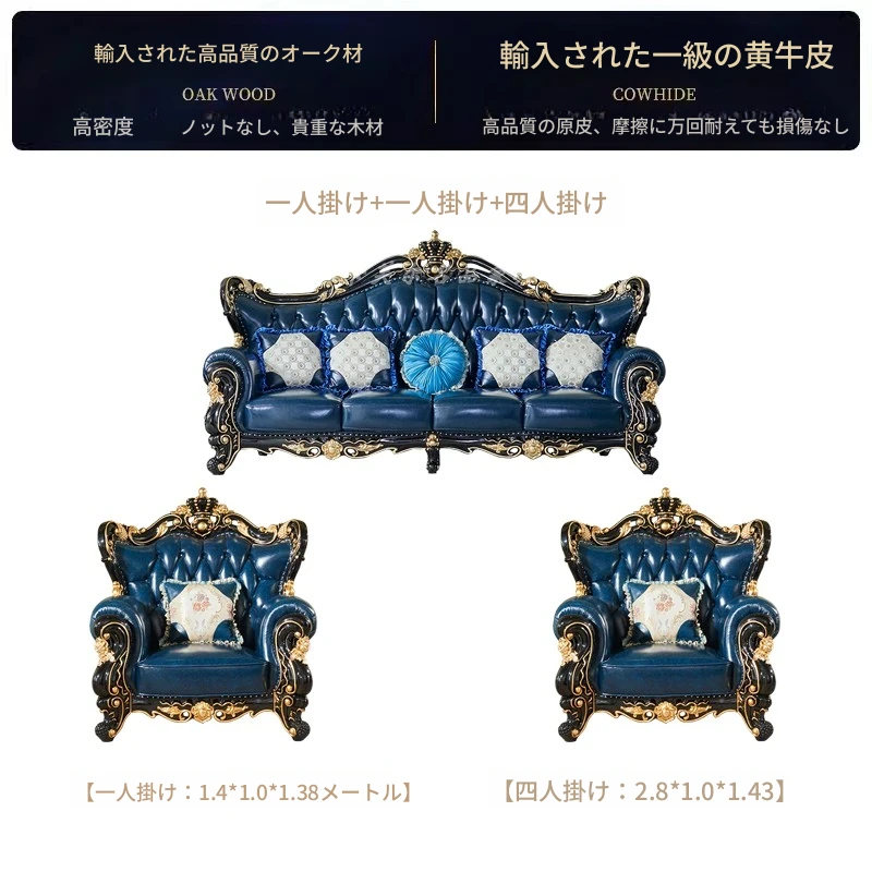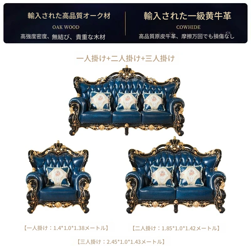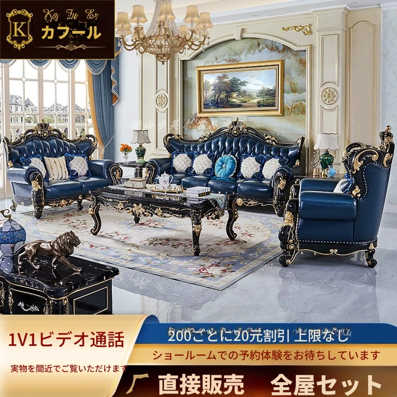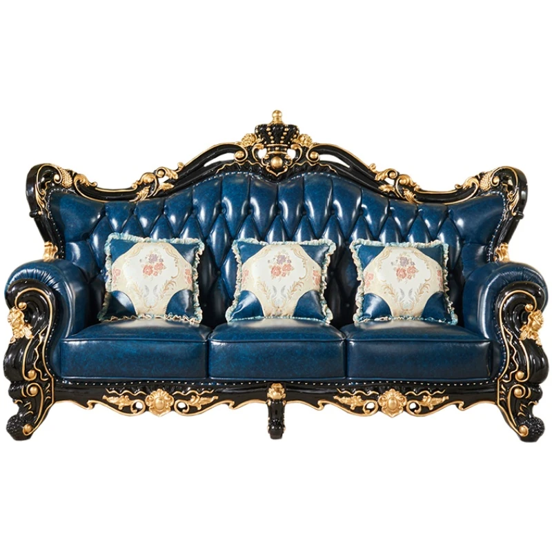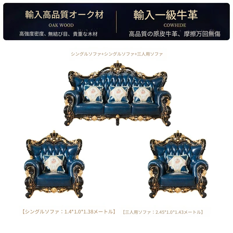 ヨーロピアンスタイルの本革123コンビネーションソファー - 軽やかなラグジュアリー、別荘のリビングに最適な高級実木彫刻の宮廷クラウンソファーで、極上の贅沢をお楽しみください!