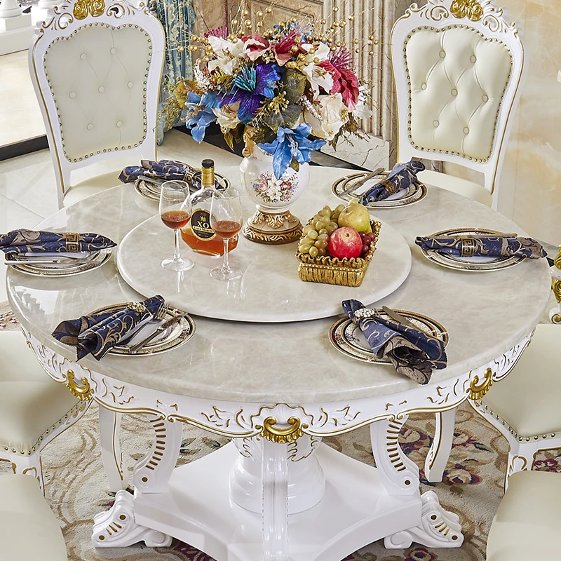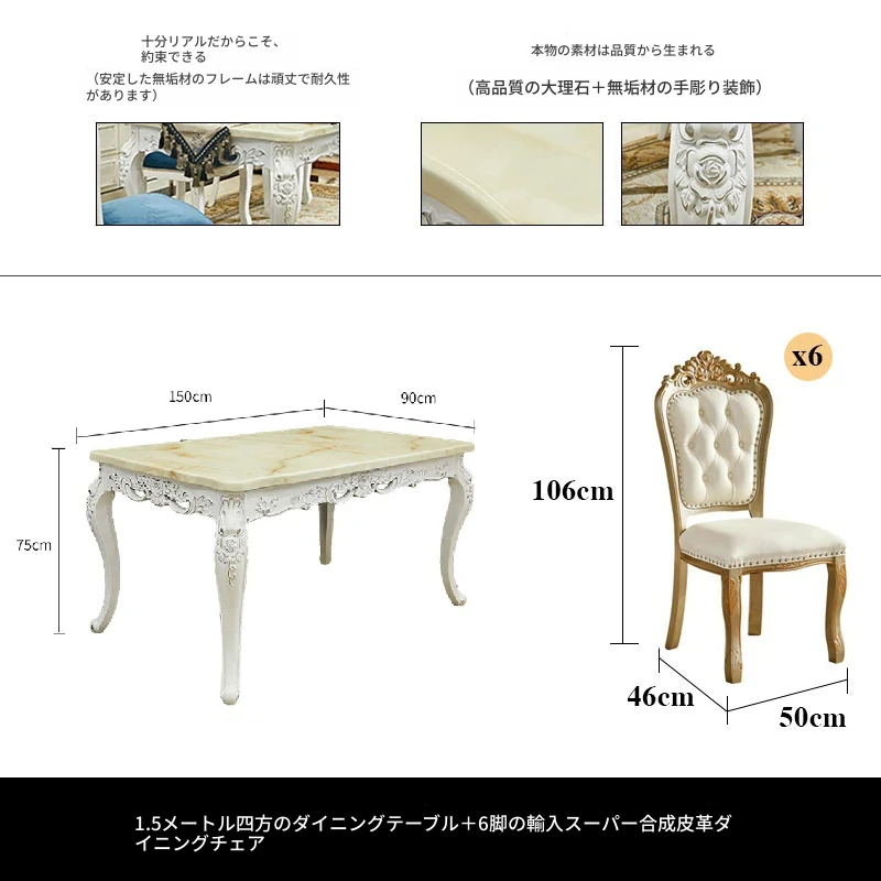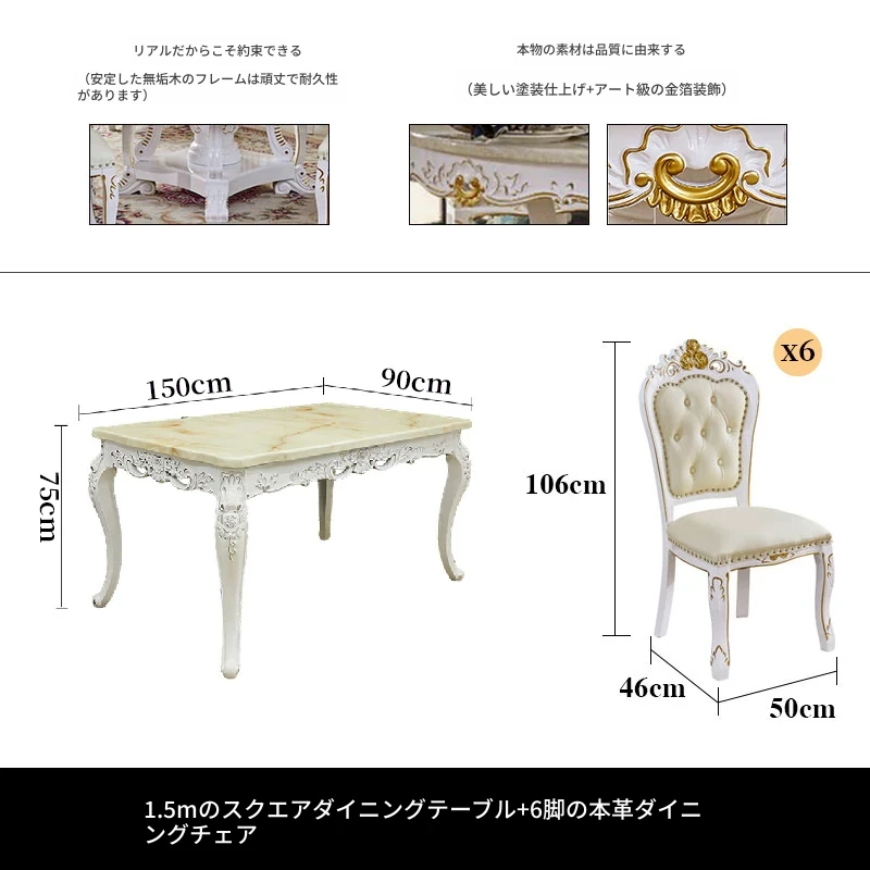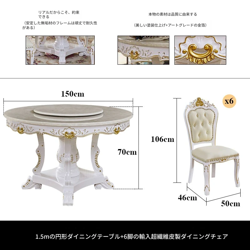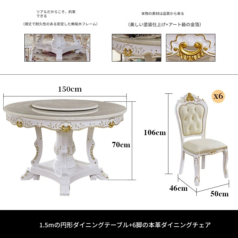 1.5メートル円形ダイニングテーブル+6脚の本革ダイニングチェア