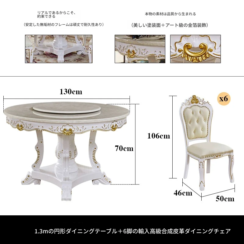 1.3メートル円形ダイニングテーブル+6脚の本革ダイニングチェア