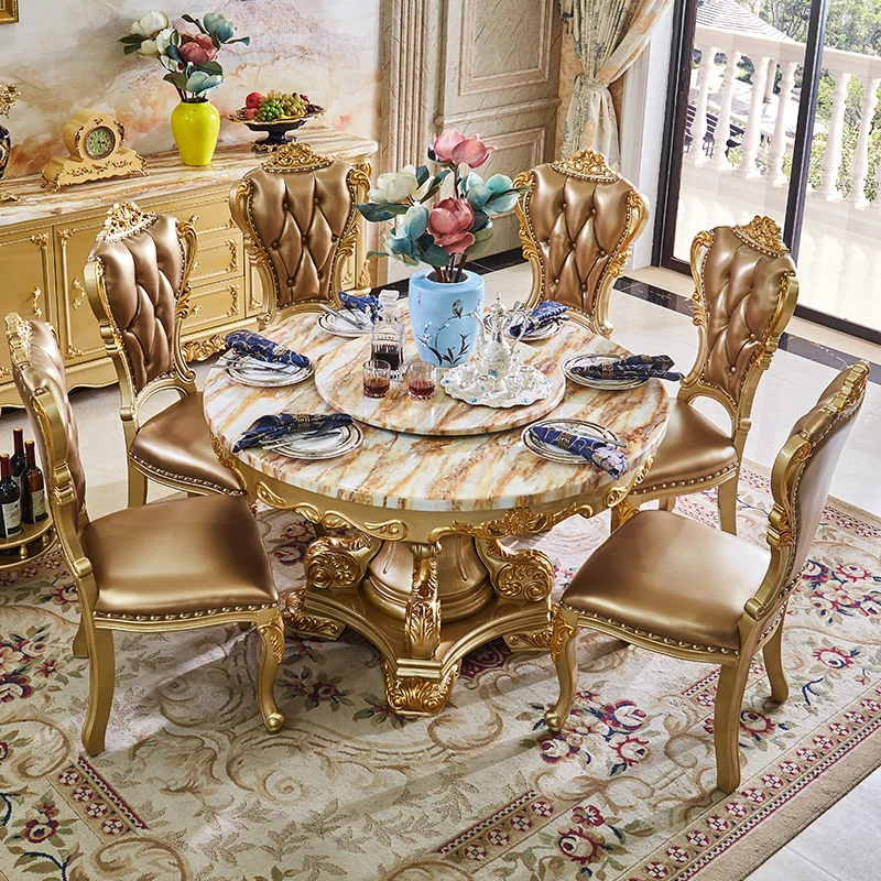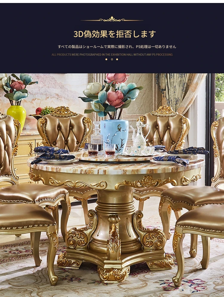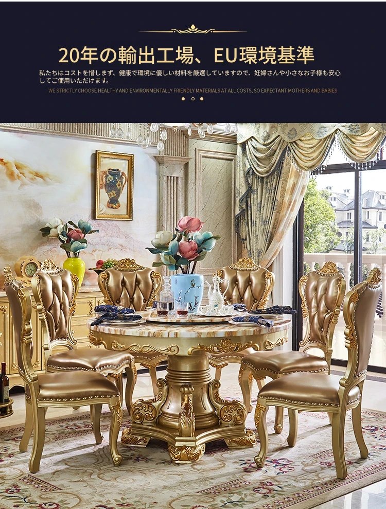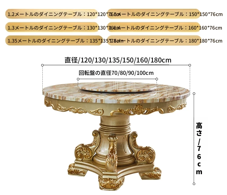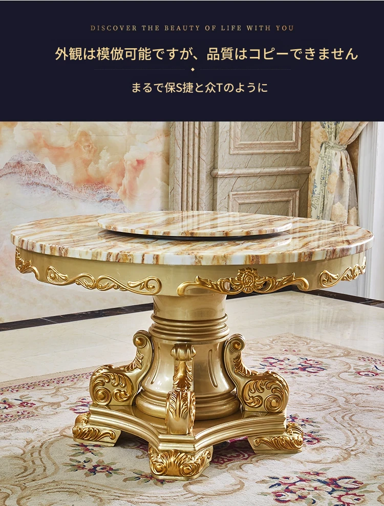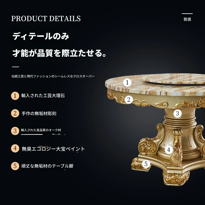 エレガントな欧風デザインのダイニングテーブルセット!天然大理石と無垢材を使用したラウンドテーブル。小型の食堂にぴったりで、回転台付きで便利。家族や友人との楽しい食事に最適なアイテムです!