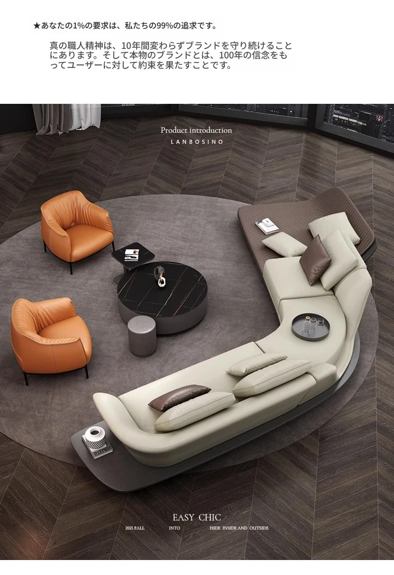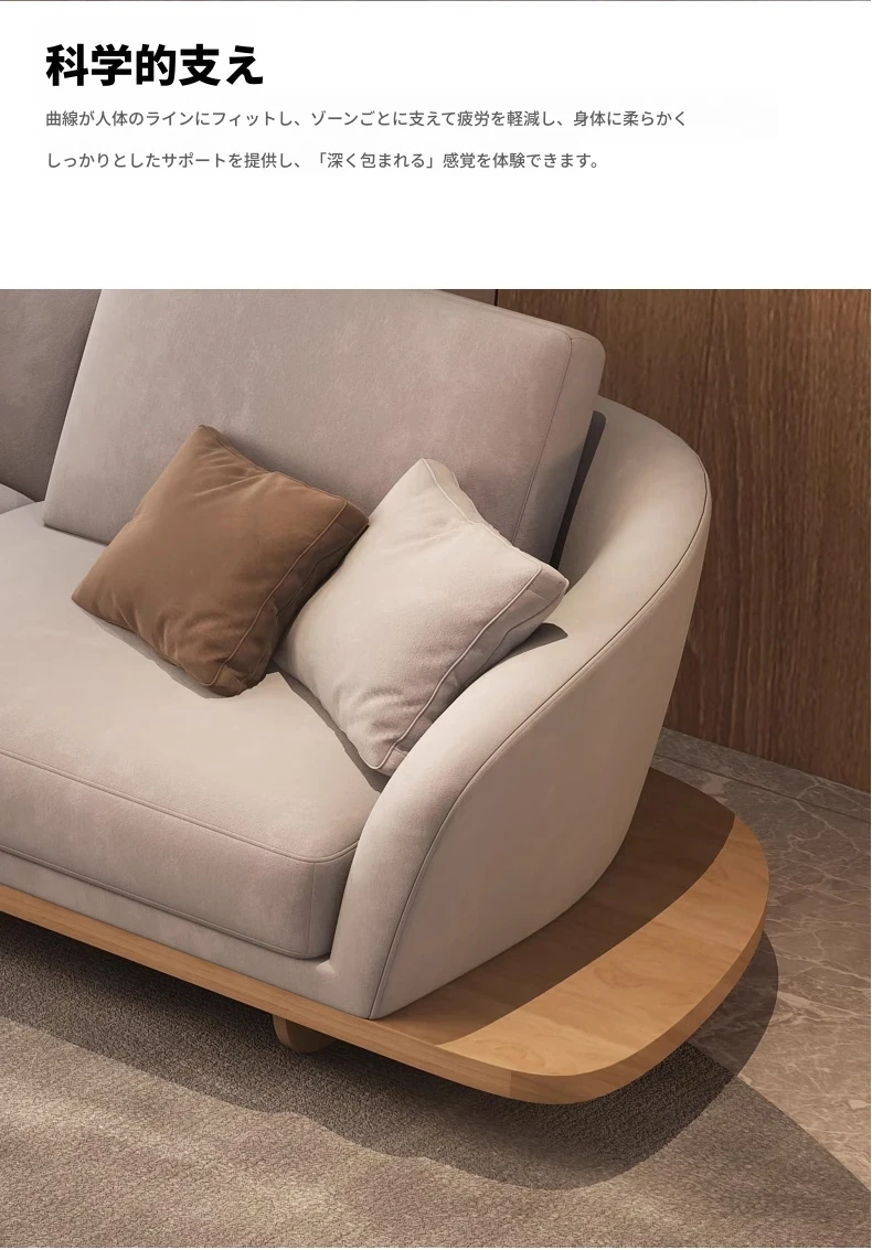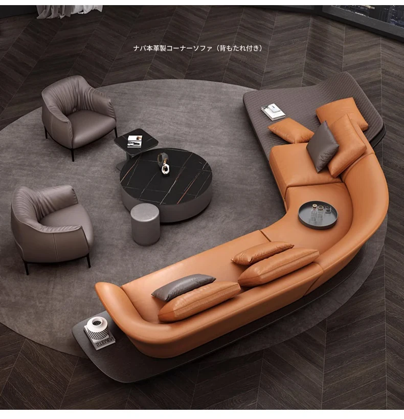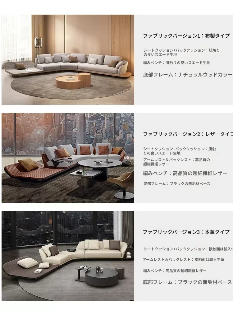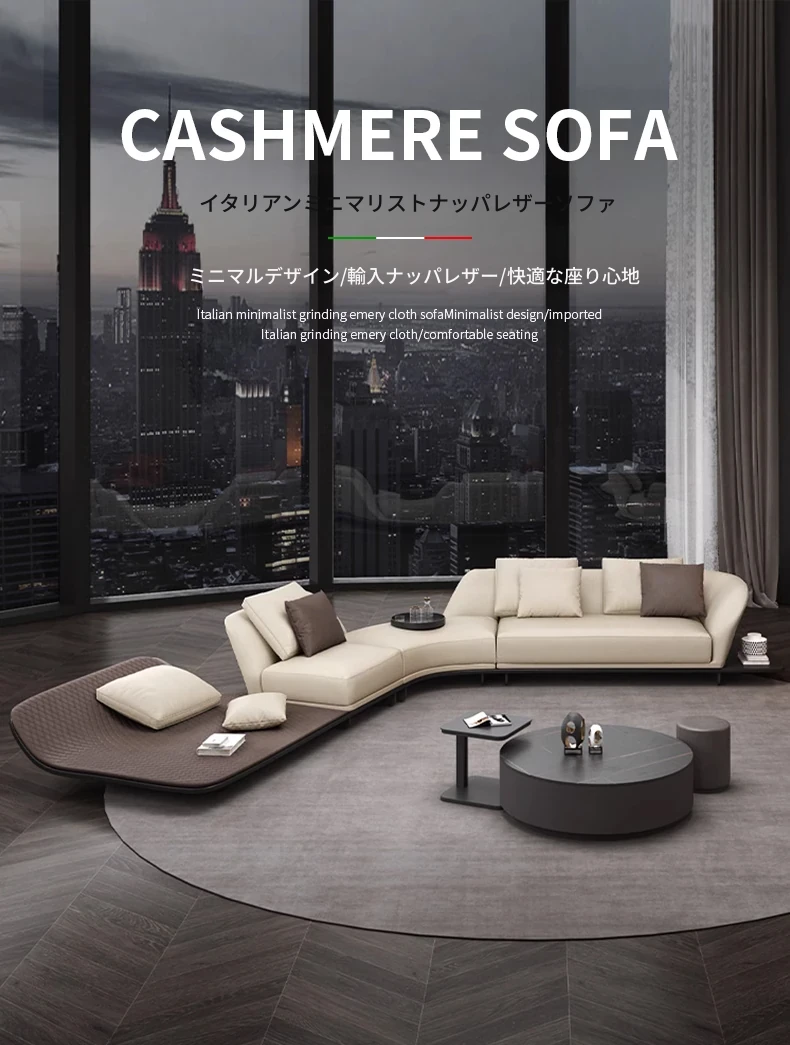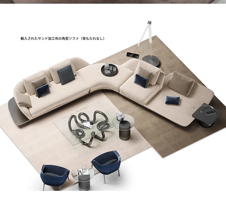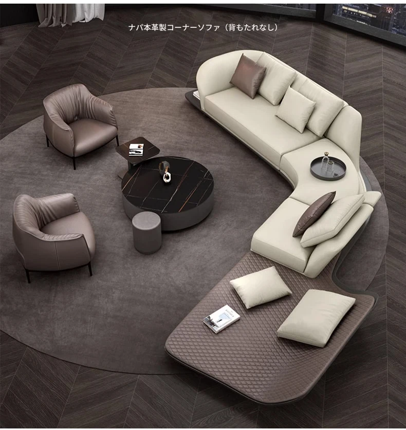 イタリアンミニマルコーナーソファ|曲線デザインでおしゃれなリビングに最適!高品質コットンリネンと本革を使用した、心地よい座り心地を実現。おしゃれなサンプルルームにもぴったりな一品です!