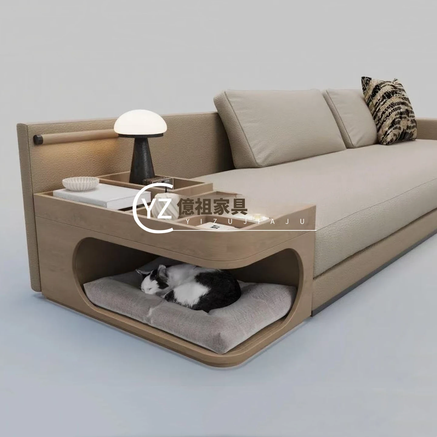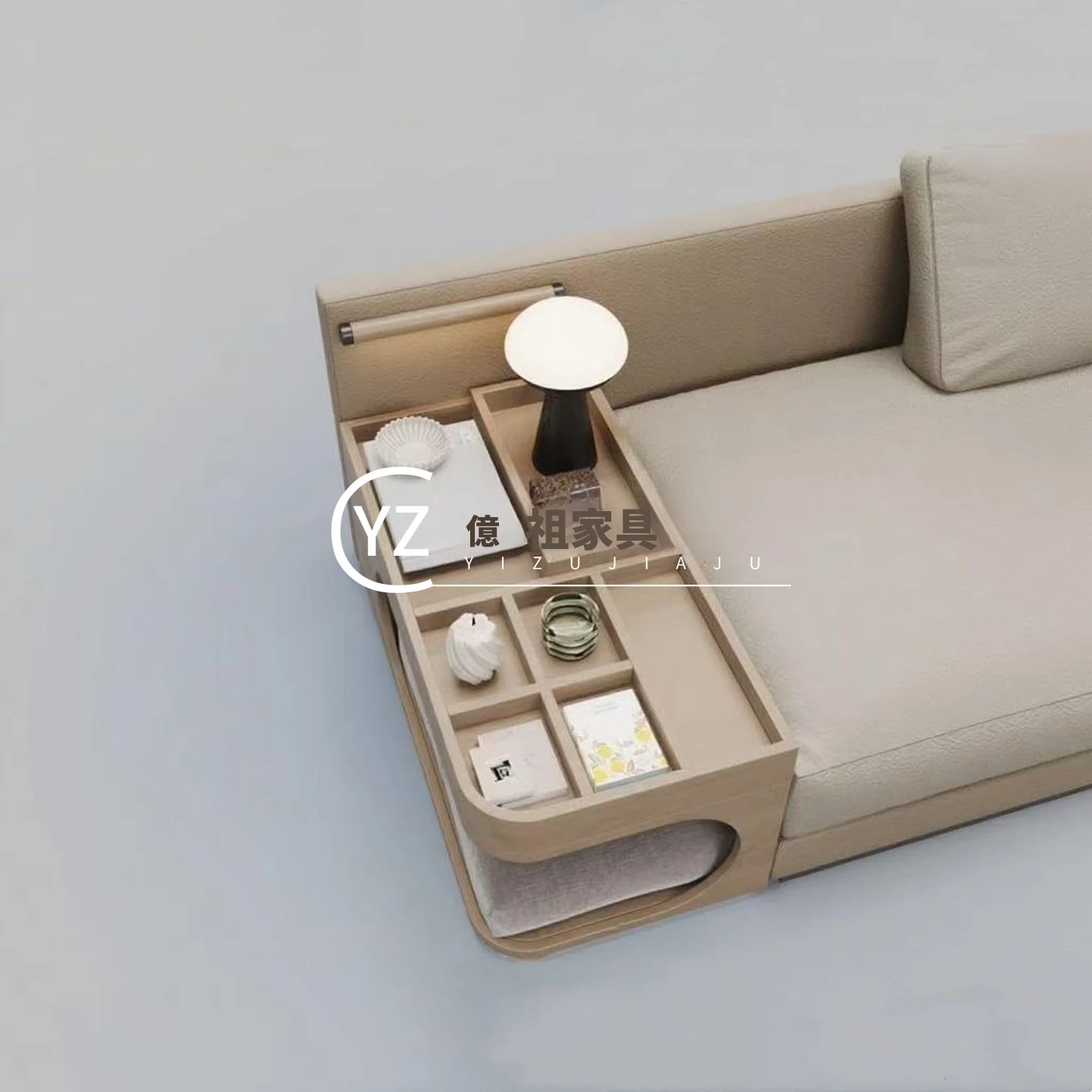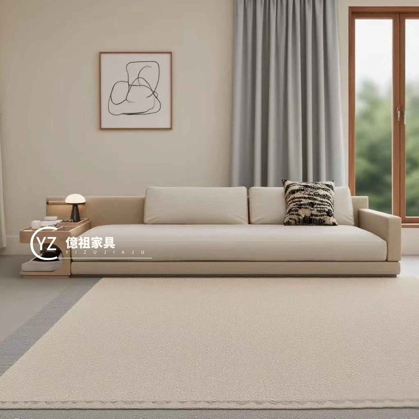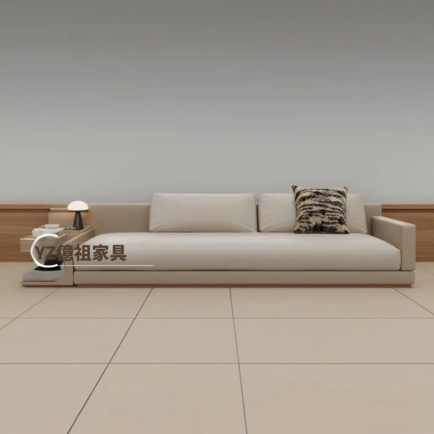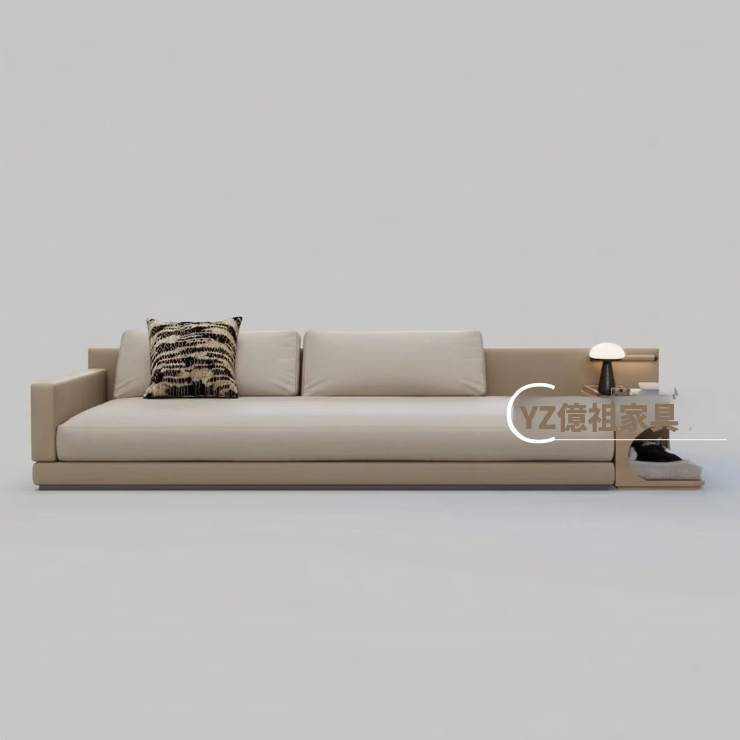 イタリアンミニマルデザインの布製ダブル3人掛けソファ - モデルルームやホテル、クラブハウスにぴったりのスタイリッシュなサイドテーブル付きソファ。洗練された空間を演出し、心地よいひとときを提供します。