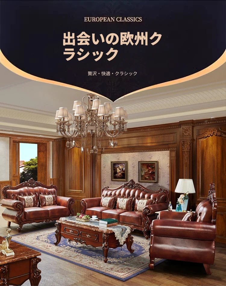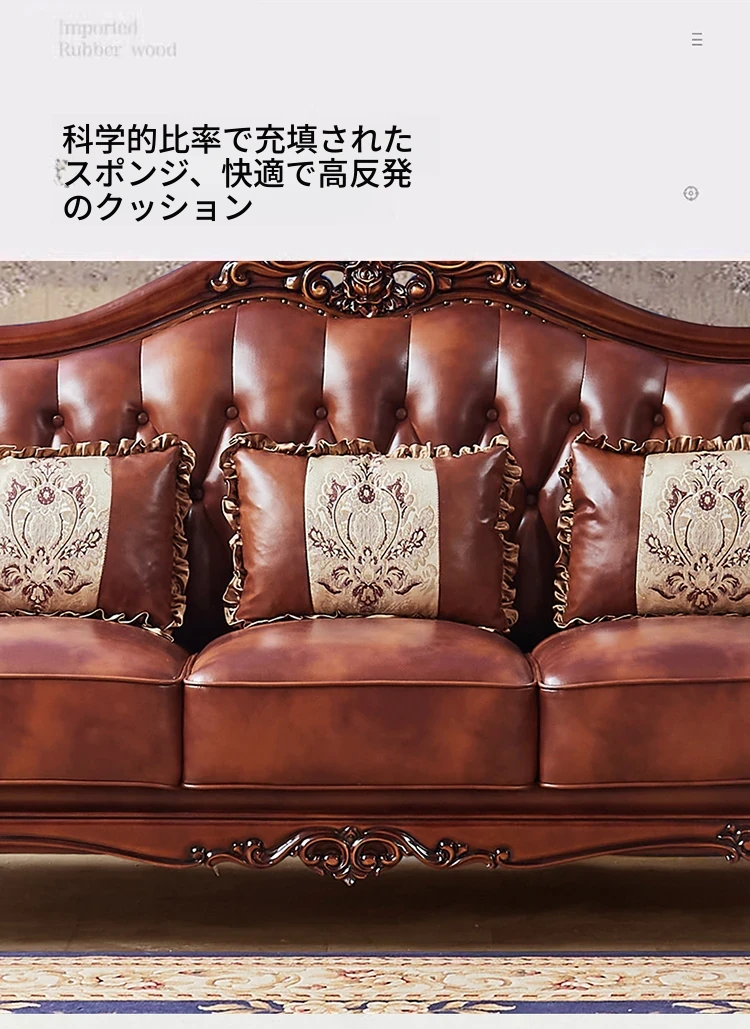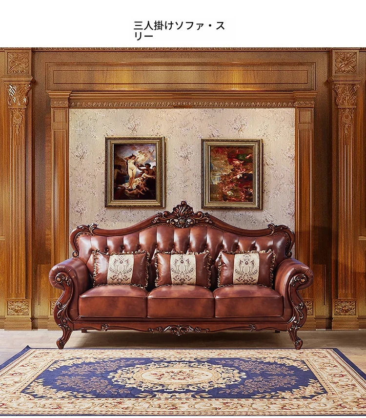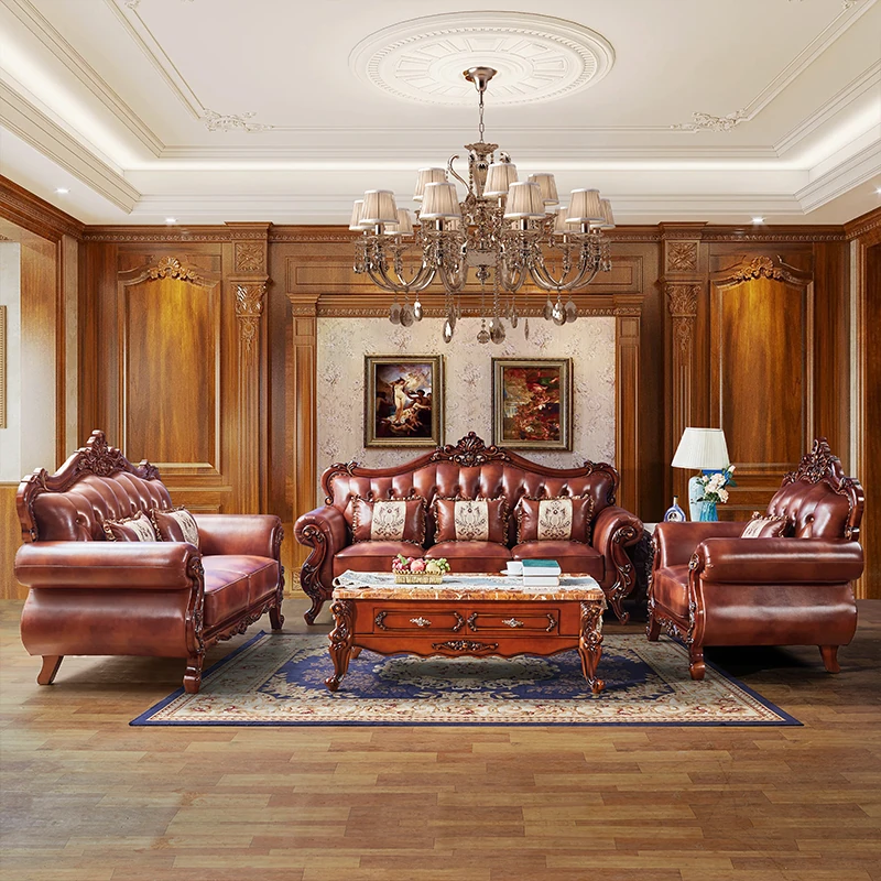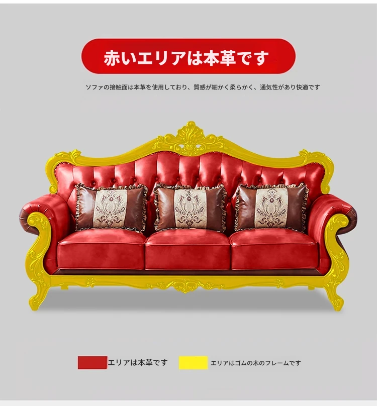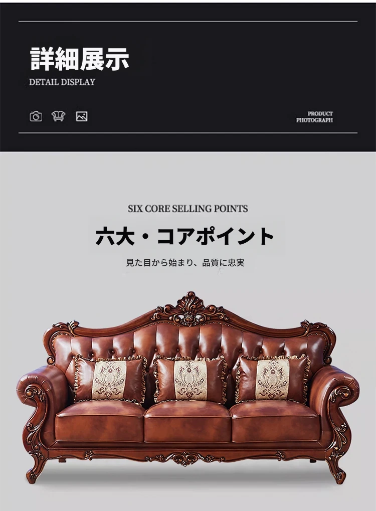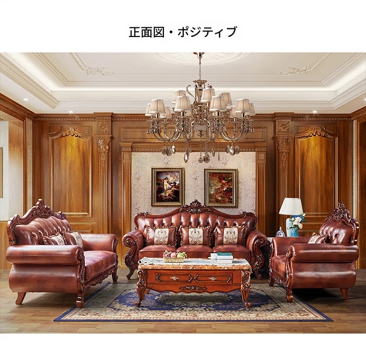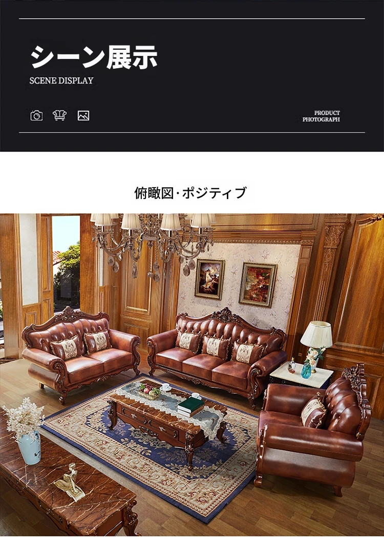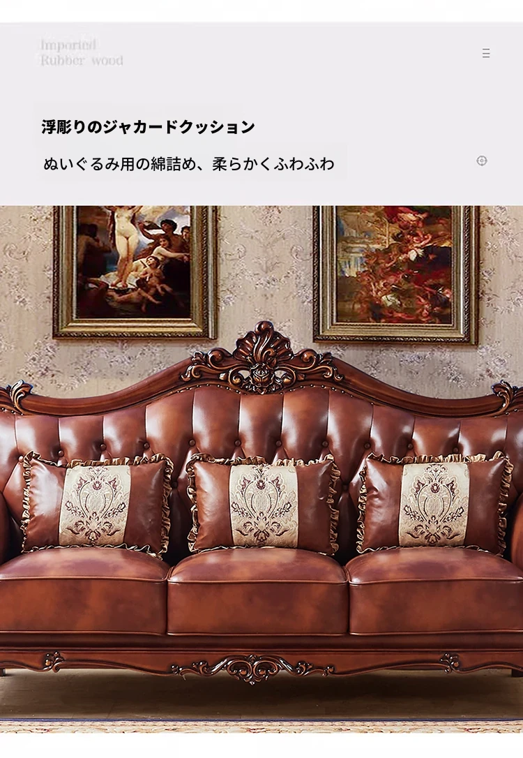 ヨーロピアンスタイルの本革ソファ!一層の牛革を使用した豪華なリビング用セット。美しい木彫りデザインのアメリカンスタイル家具、贅沢な貴妃ソファで、あなたの空間を特別なものに。