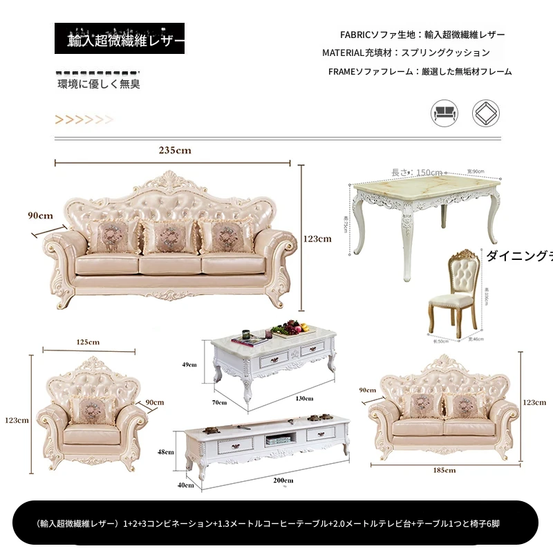 輸入超ファイバーレザー1+2+3組+1.3メートル大理石テーブル+2.0メートルテレビキャビネット+1テーブル6椅子