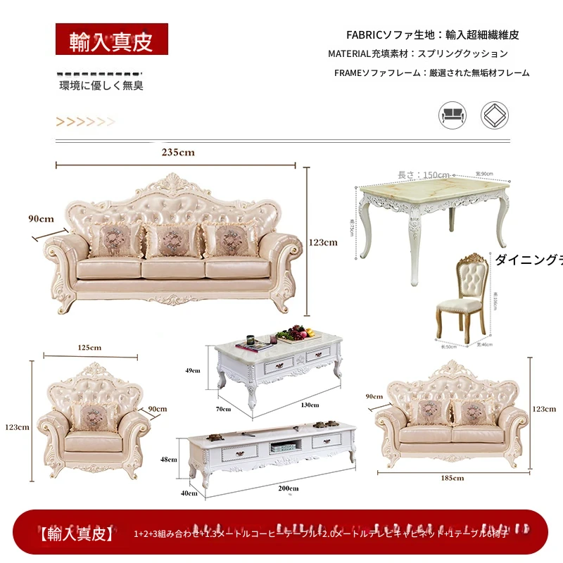 輸入本革1+2+3組+1.3メートル大理石テーブル+2.0メートルテレビキャビネット+1テーブル6椅子