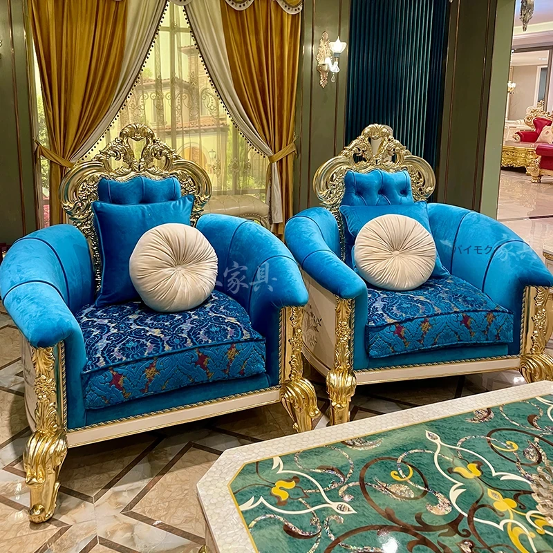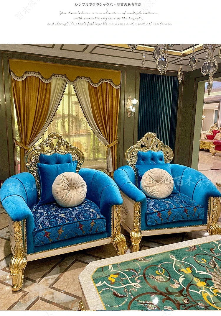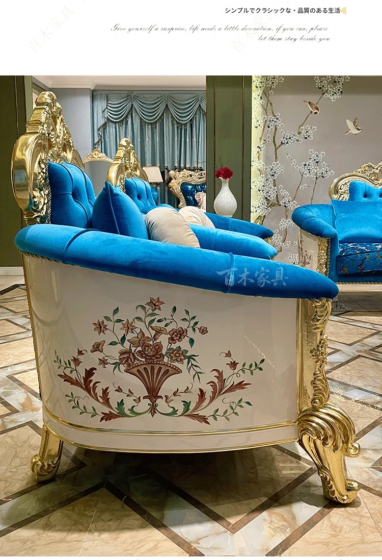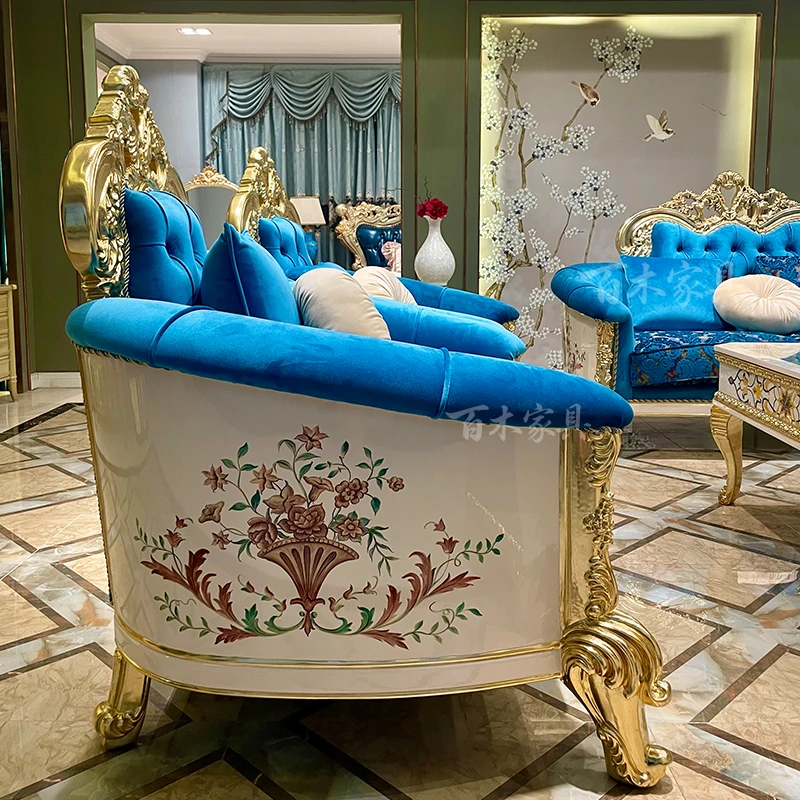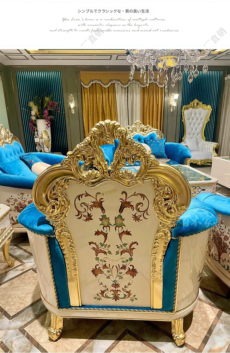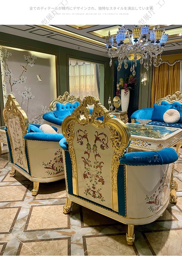 フランス風高級無垢材ソファー|別荘リビングに最適な彫刻入りゴールドリーフ装飾の布張りソファ|広いお部屋にぴったりの豪華コンビネーション家具