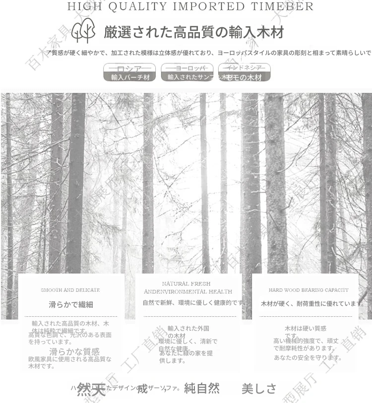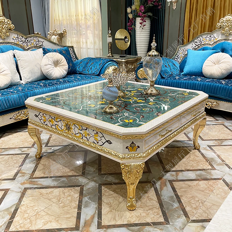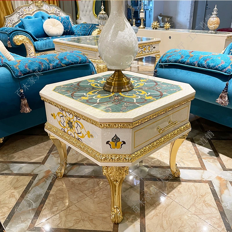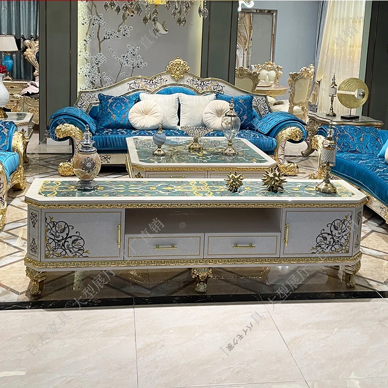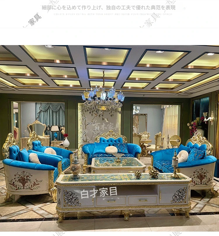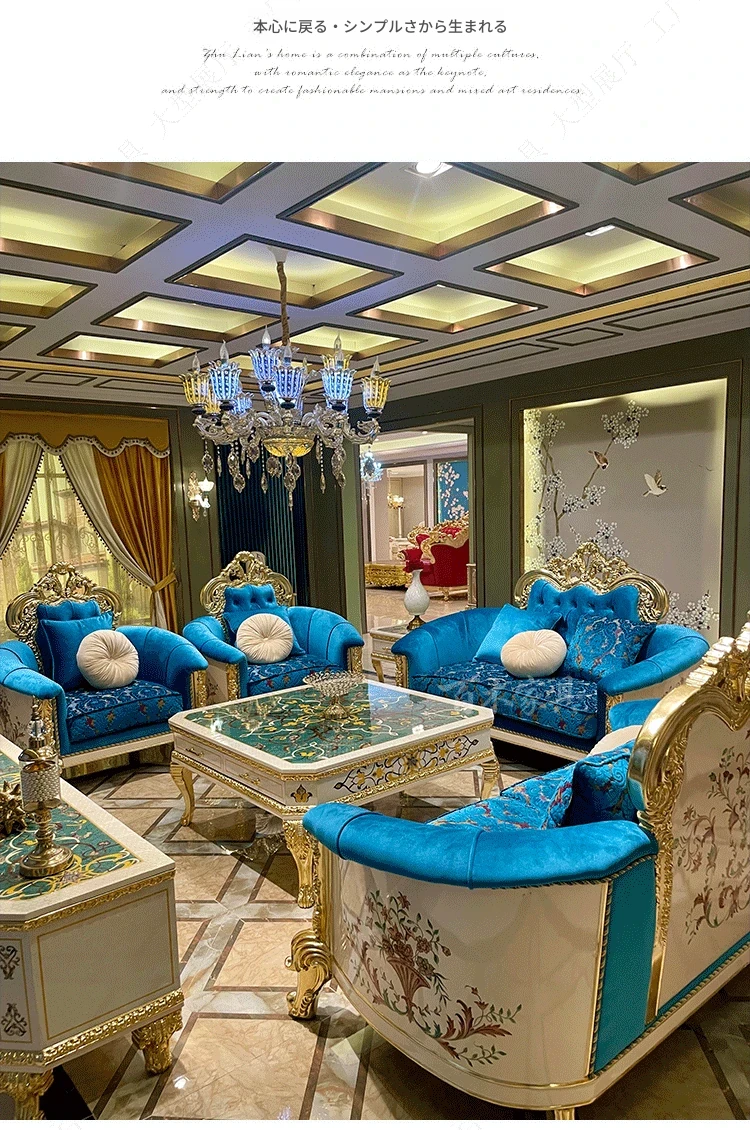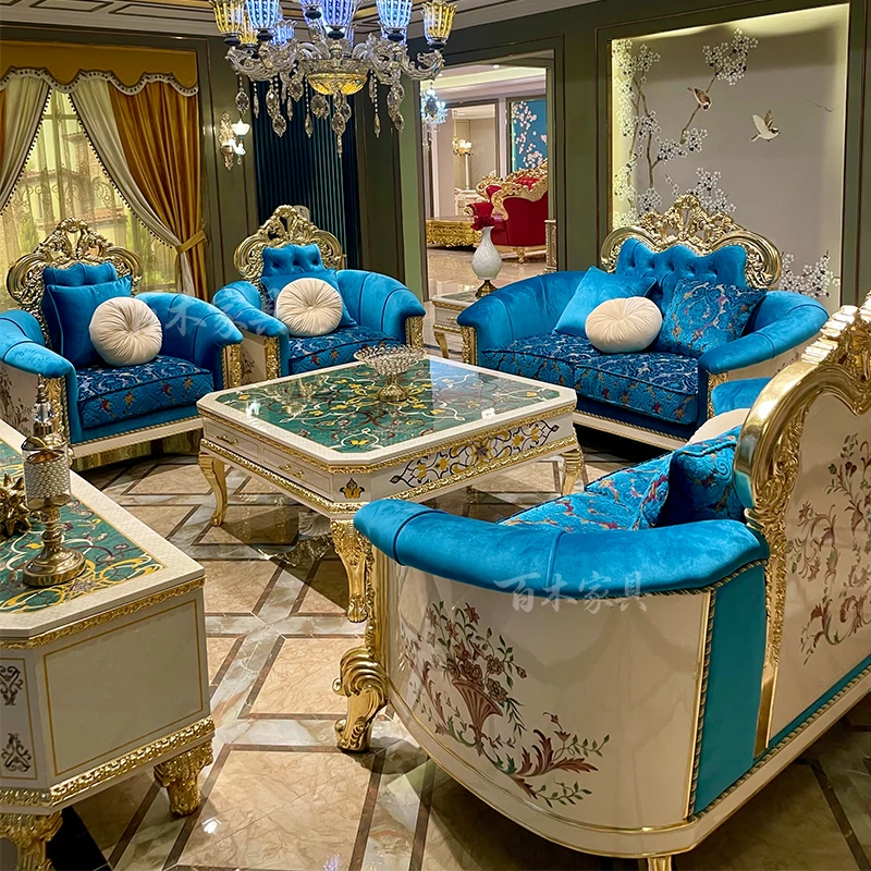 フランス風高級無垢材ソファー|別荘リビングに最適な彫刻入りゴールドリーフ装飾の布張りソファ|広いお部屋にぴったりの豪華コンビネーション家具