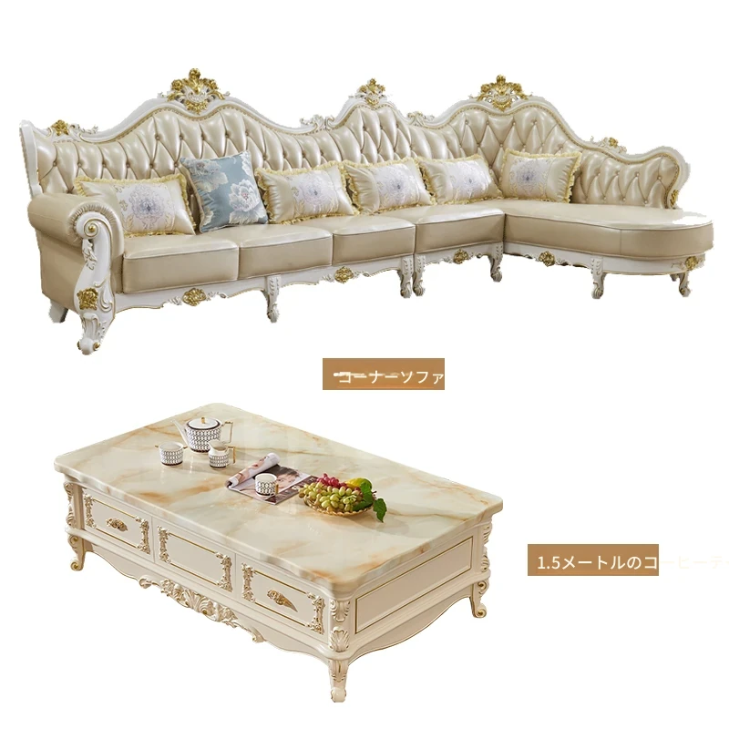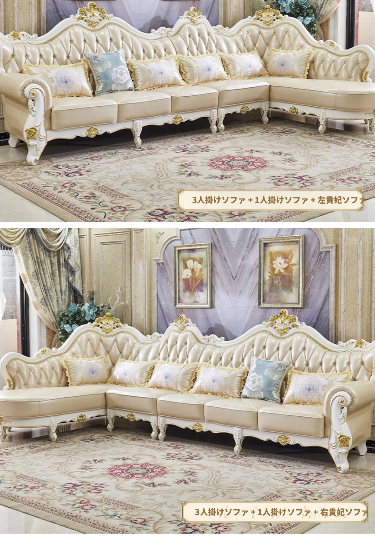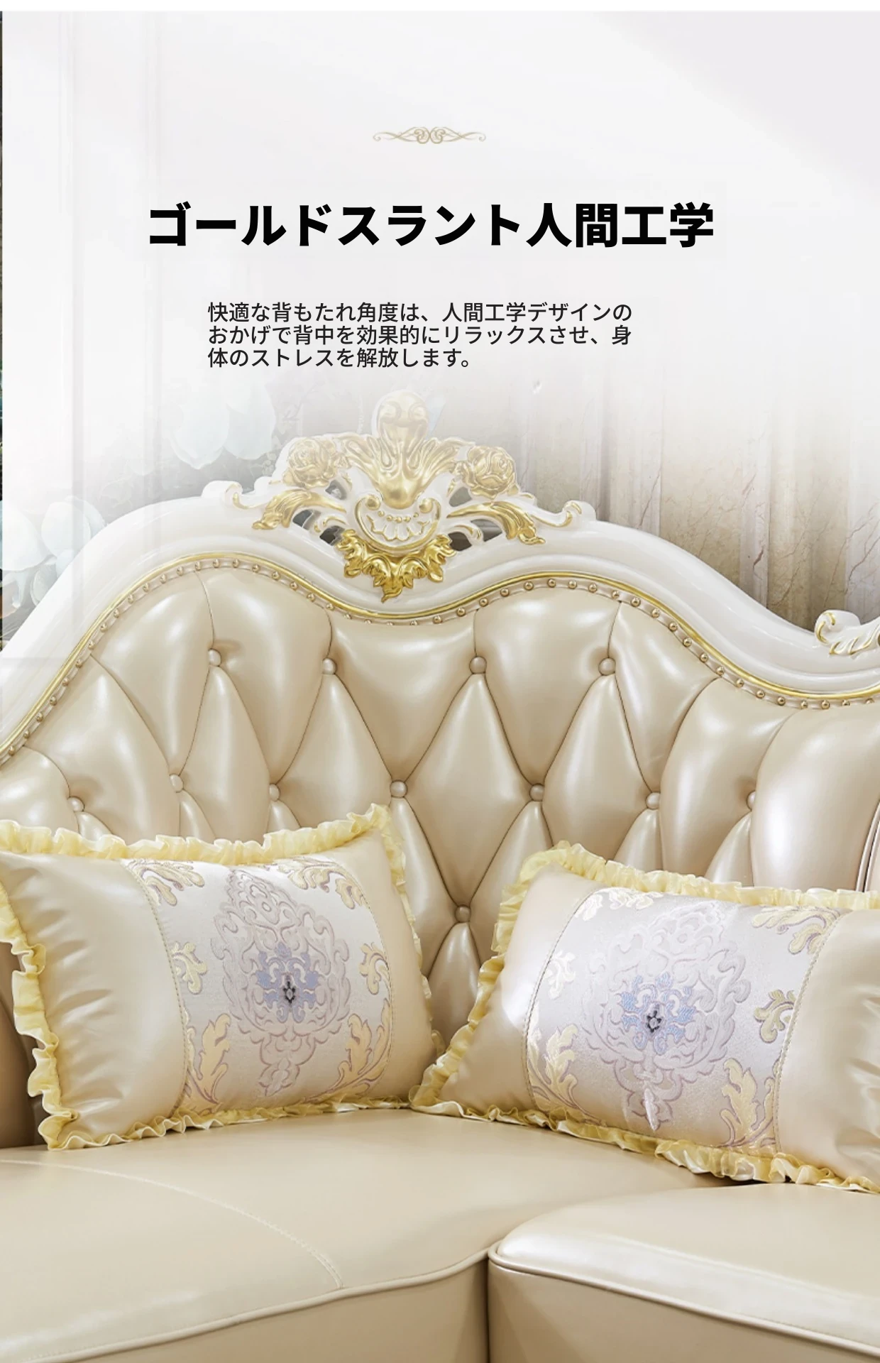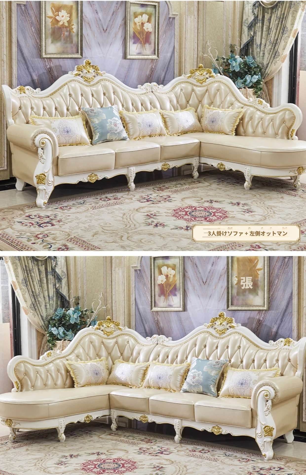 贅沢なヨーロッパスタイルの本革コーナーソファ!高級トップグレイン牛革使用、洗練されたデザインで小型住宅にもぴったり。美しい木彫りのフレームが魅力のリビング家具。あなたの空間を特別に演出します!