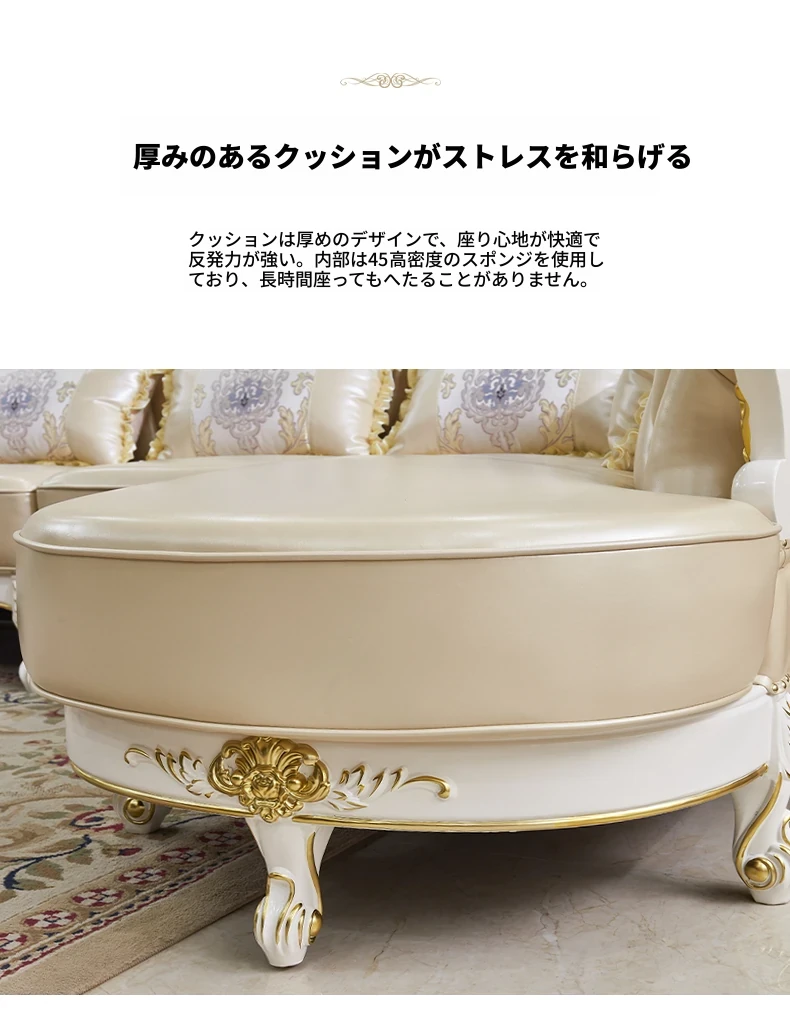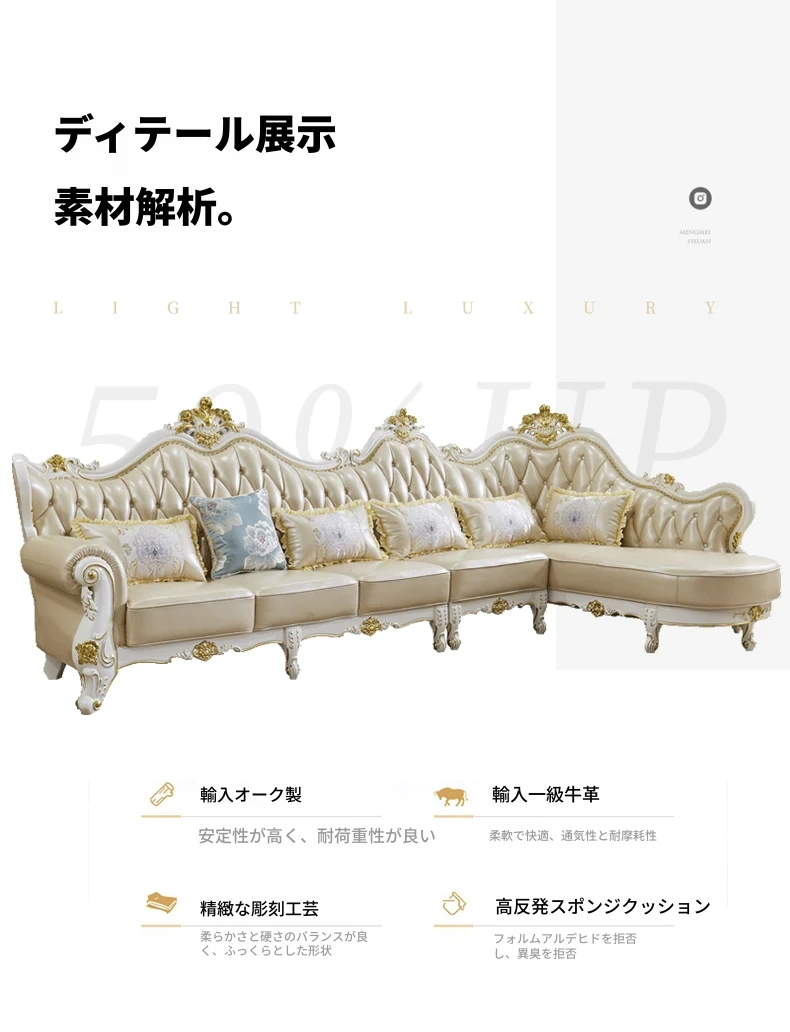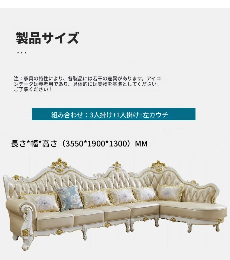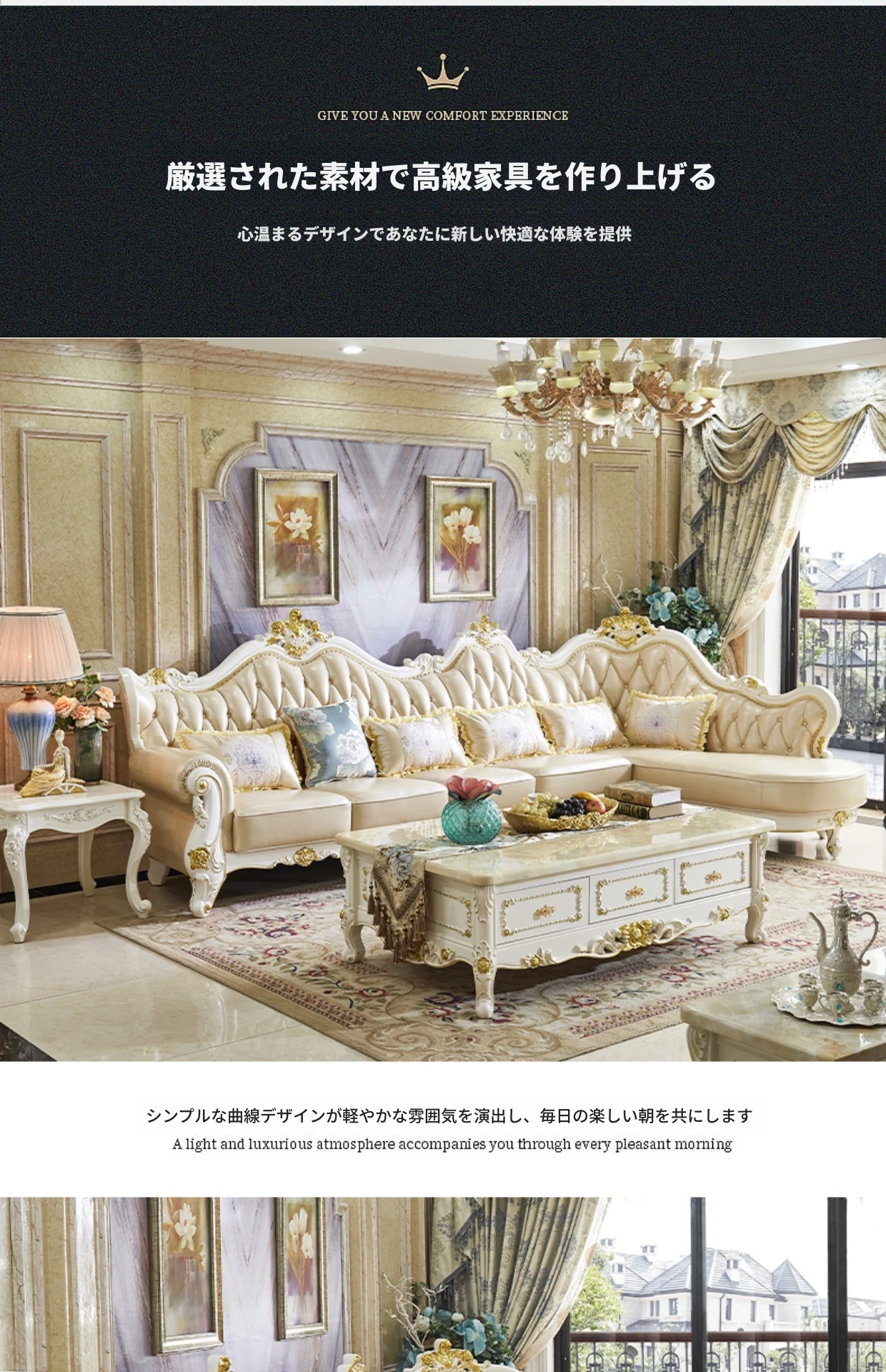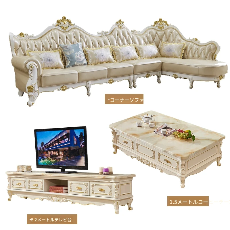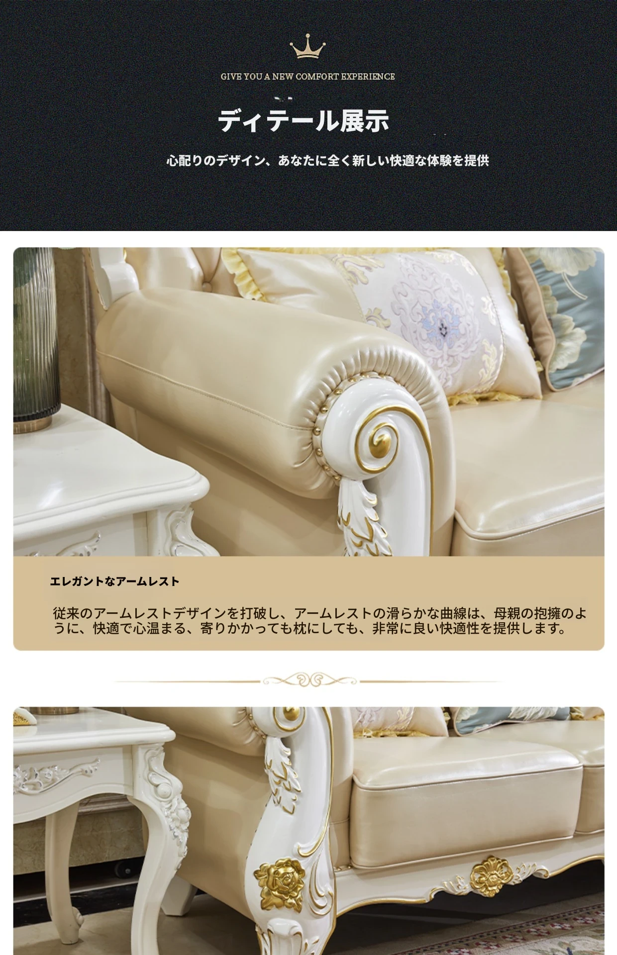 贅沢なヨーロッパスタイルの本革コーナーソファ!高級トップグレイン牛革使用、洗練されたデザインで小型住宅にもぴったり。美しい木彫りのフレームが魅力のリビング家具。あなたの空間を特別に演出します!
