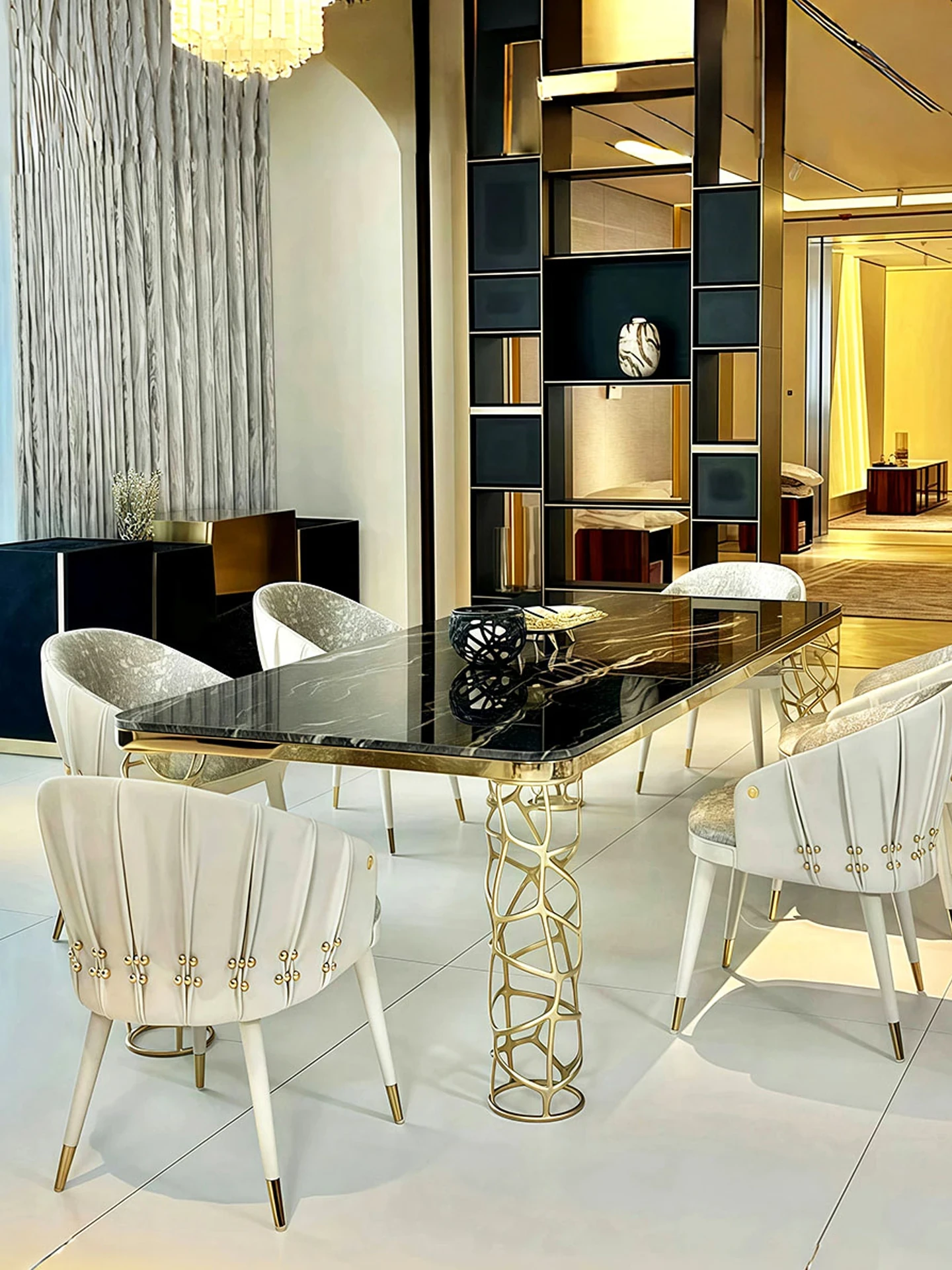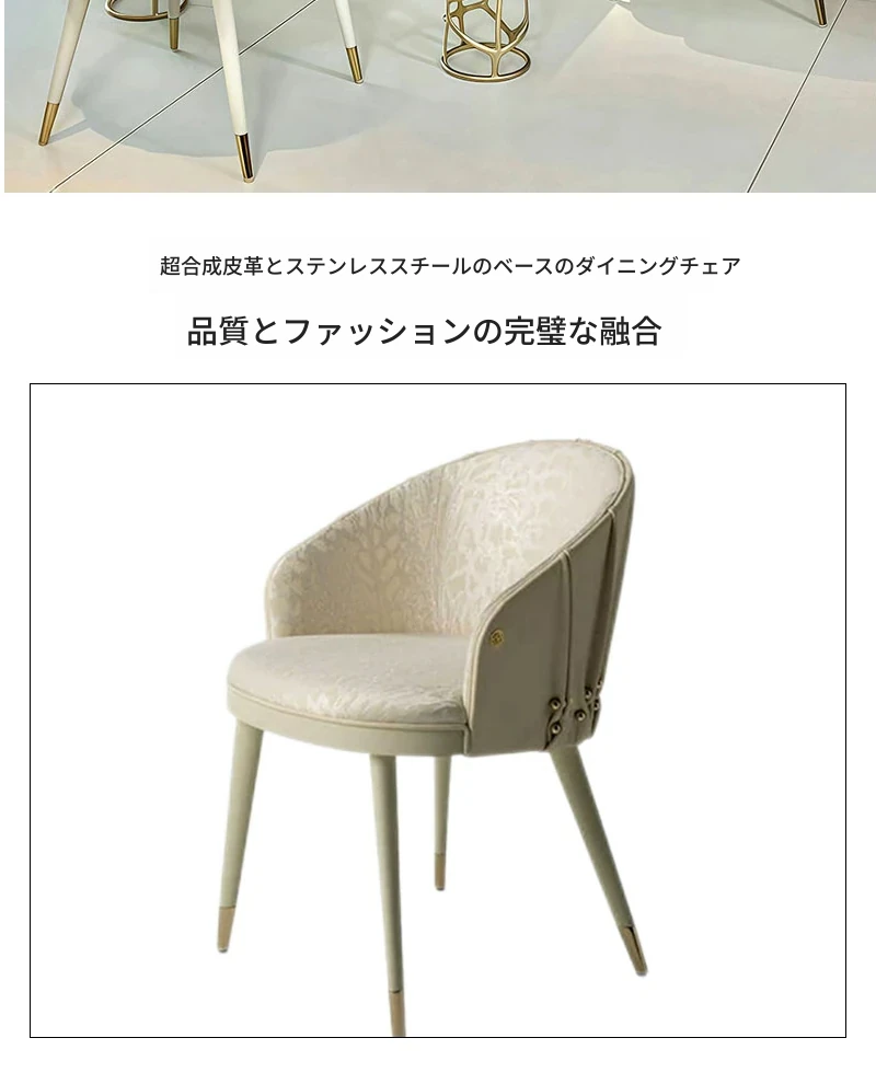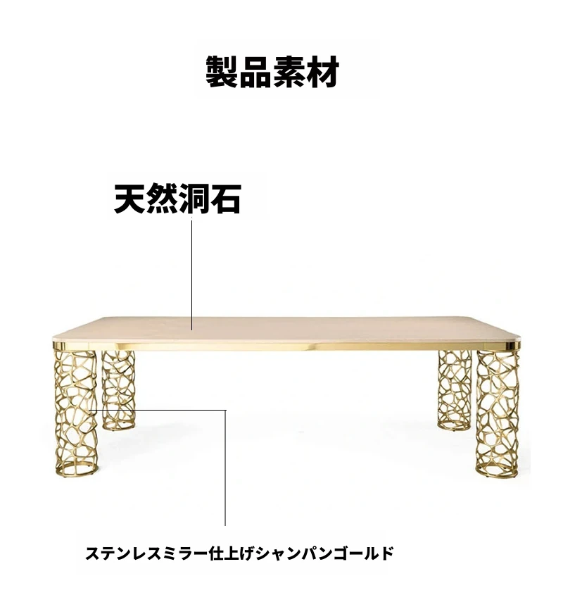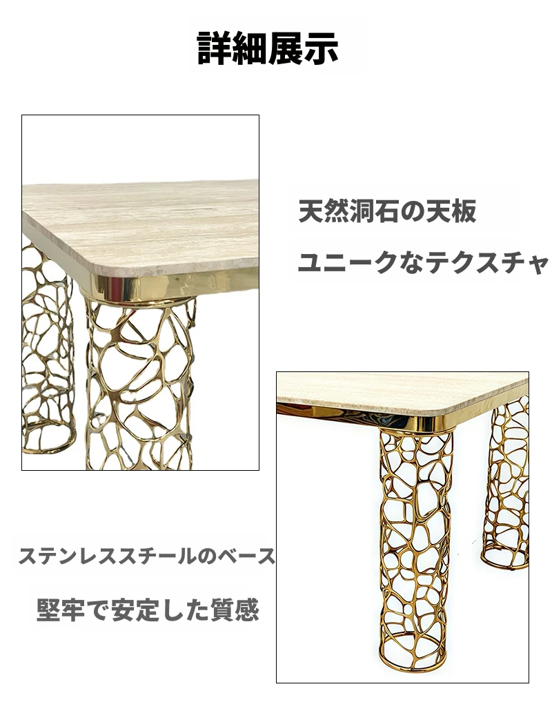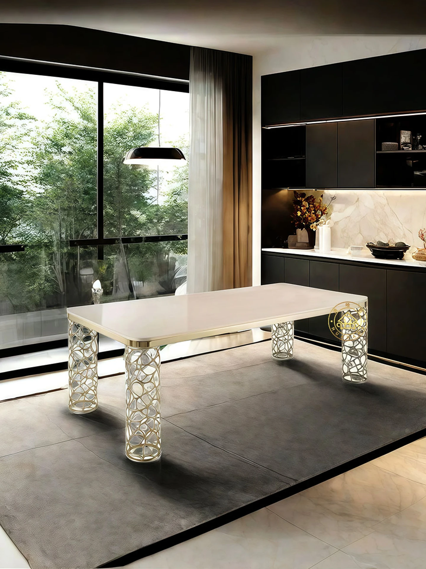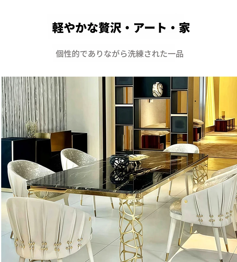 ラグジュアリーな軽奢感!洗練されたデザインの洞石ダイニングテーブル&チェアセット。高級感あふれる透かし模様のスクエアテーブルは、創造的なステンレス製で、あなたの食卓を華やかに彩ります。家庭用にも最適!