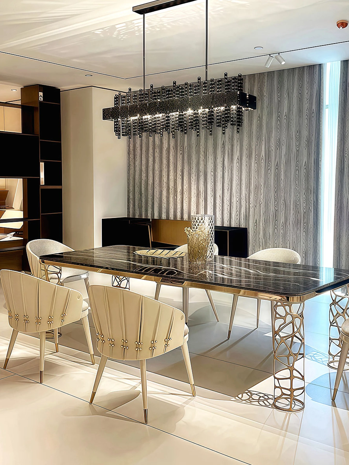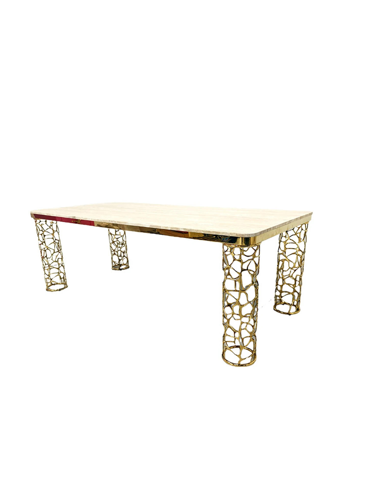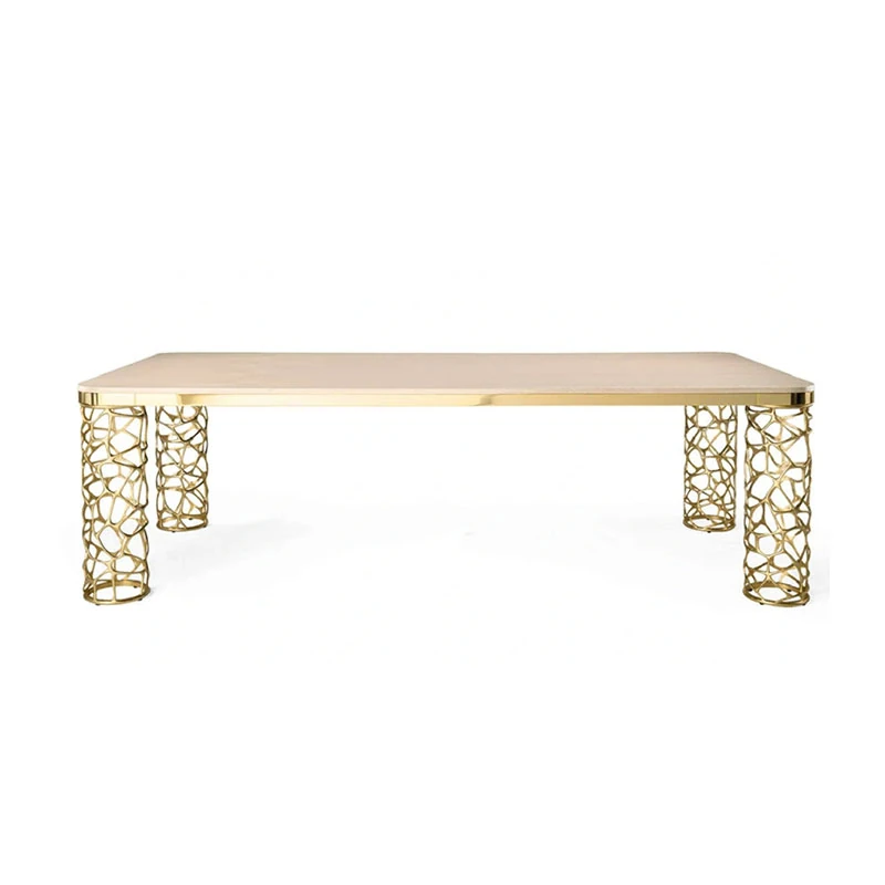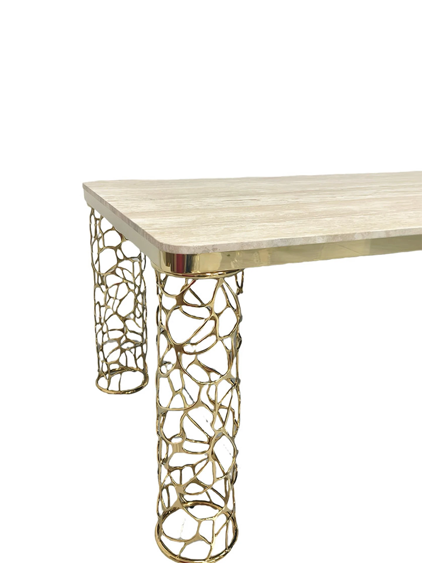 ラグジュアリーな軽奢感!洗練されたデザインの洞石ダイニングテーブル&チェアセット。高級感あふれる透かし模様のスクエアテーブルは、創造的なステンレス製で、あなたの食卓を華やかに彩ります。家庭用にも最適!