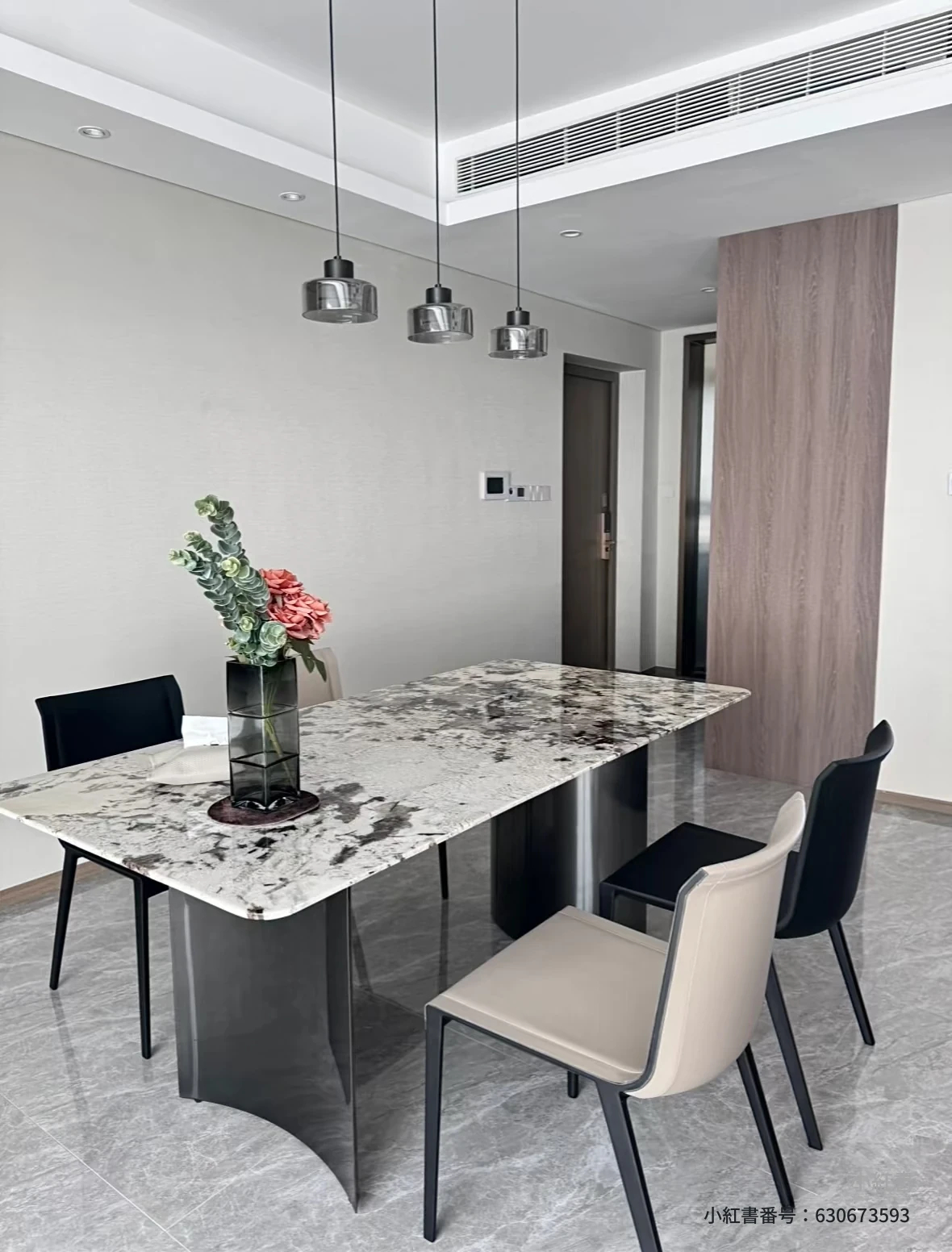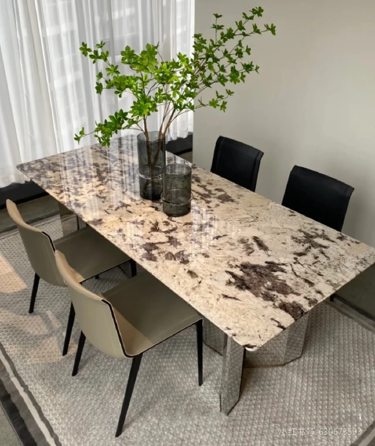 現代的でシンプルなデザインのラグジュアリーな長方形ダイニングテーブルと椅子のセット、上質な石材を使用したホーム用食卓。贅沢な食事体験をあなたの家に!