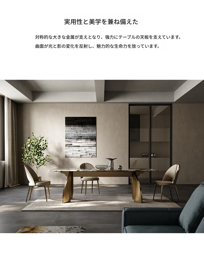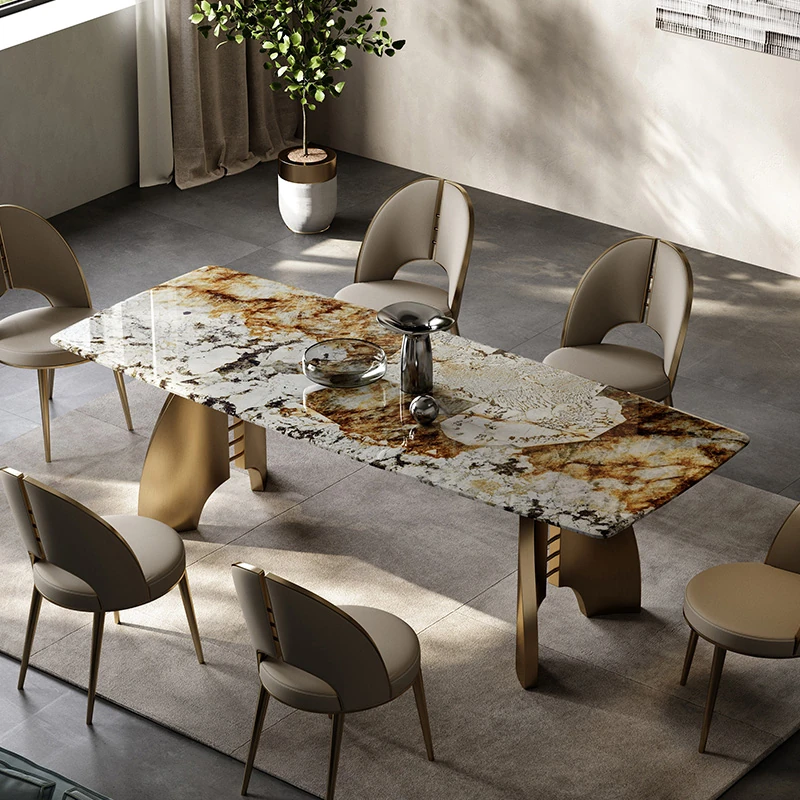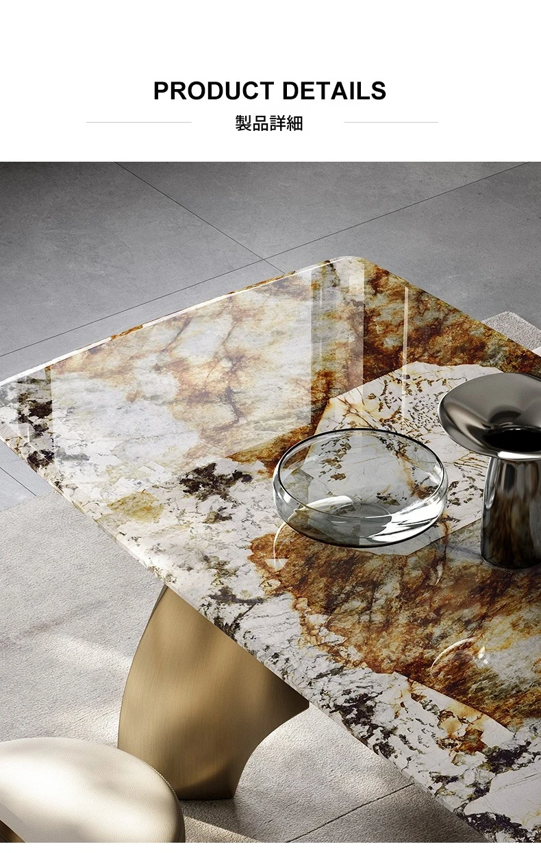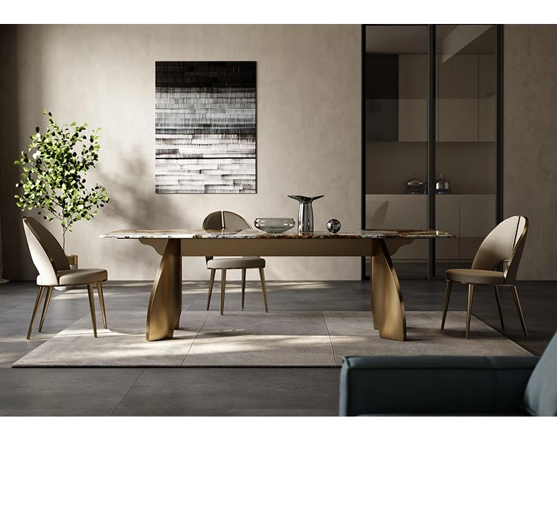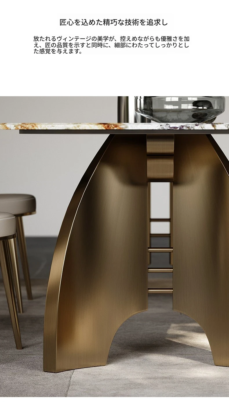 軽奢感溢れる洞石製ダイニングテーブル&チェアセット!豪華な家庭用ダイニングにぴったりなハイエンドな透かしデザインのスクエアテーブル。創造的なステンレススチール製で、食事の時間を特別なひとときに演出します。