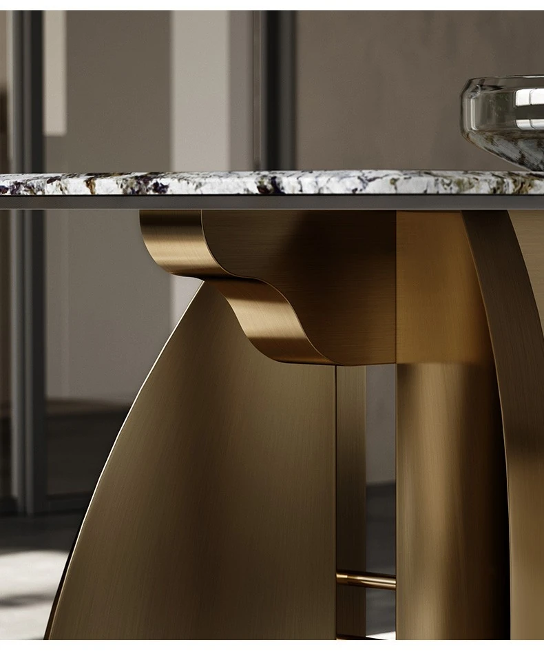 イタリアンラグジュアリー 丸型天然大理石ダイニングテーブル - イタリアデザインのステンレス製テーブル&チェアセット。高級感あふれる本格派、家族の団欒にぴったりな無垢材使用の食卓。