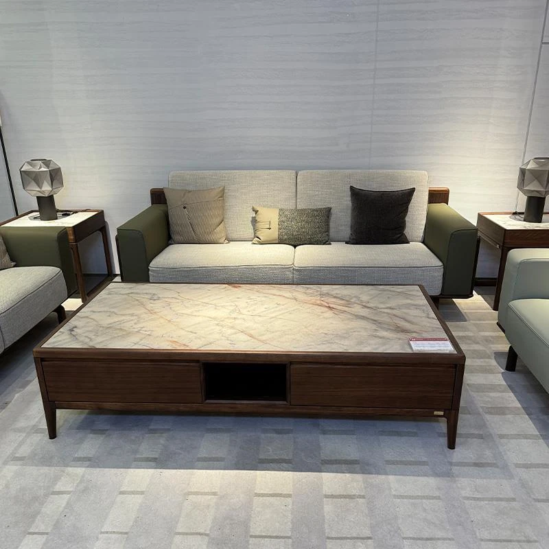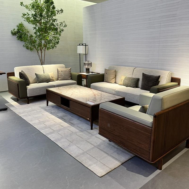 新中式スタイルの高品質無垢材ソファセット - モダンでシンプル、小型リビングに最適!北米産ブラックウォールナットとファブリックの組み合わせで、洗練された空間を演出します。