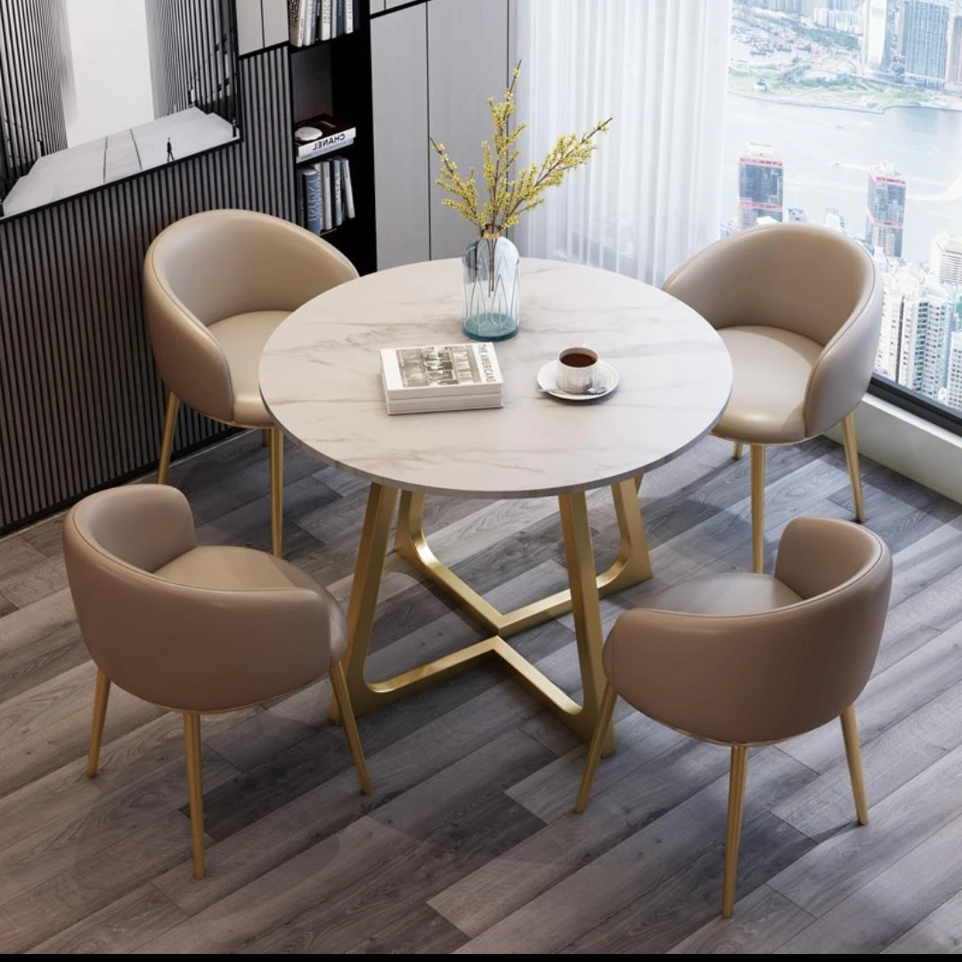 1テーブル4椅子カーキ(PUレザー)金脚白色マット岩板