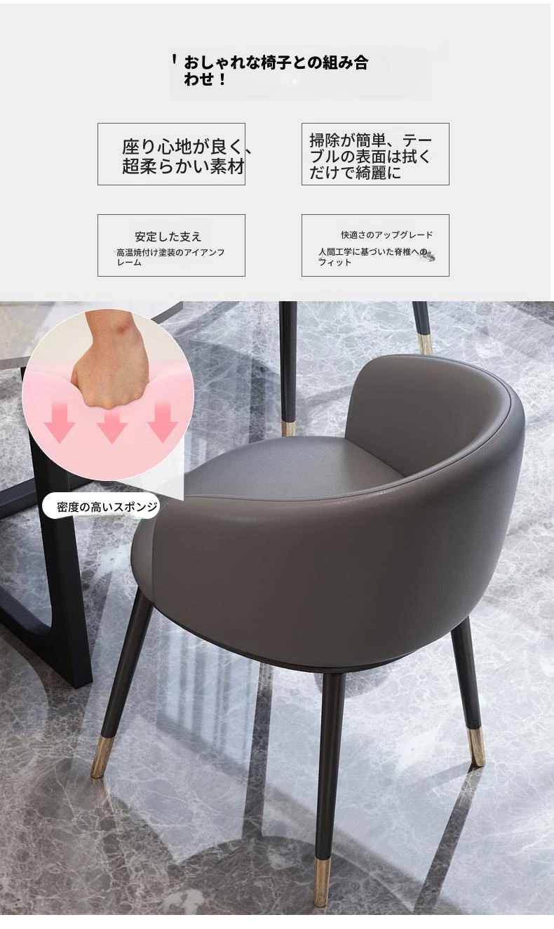 1テーブル4椅子ダークグレー(PUレザー)黒脚黒色光沢大理石